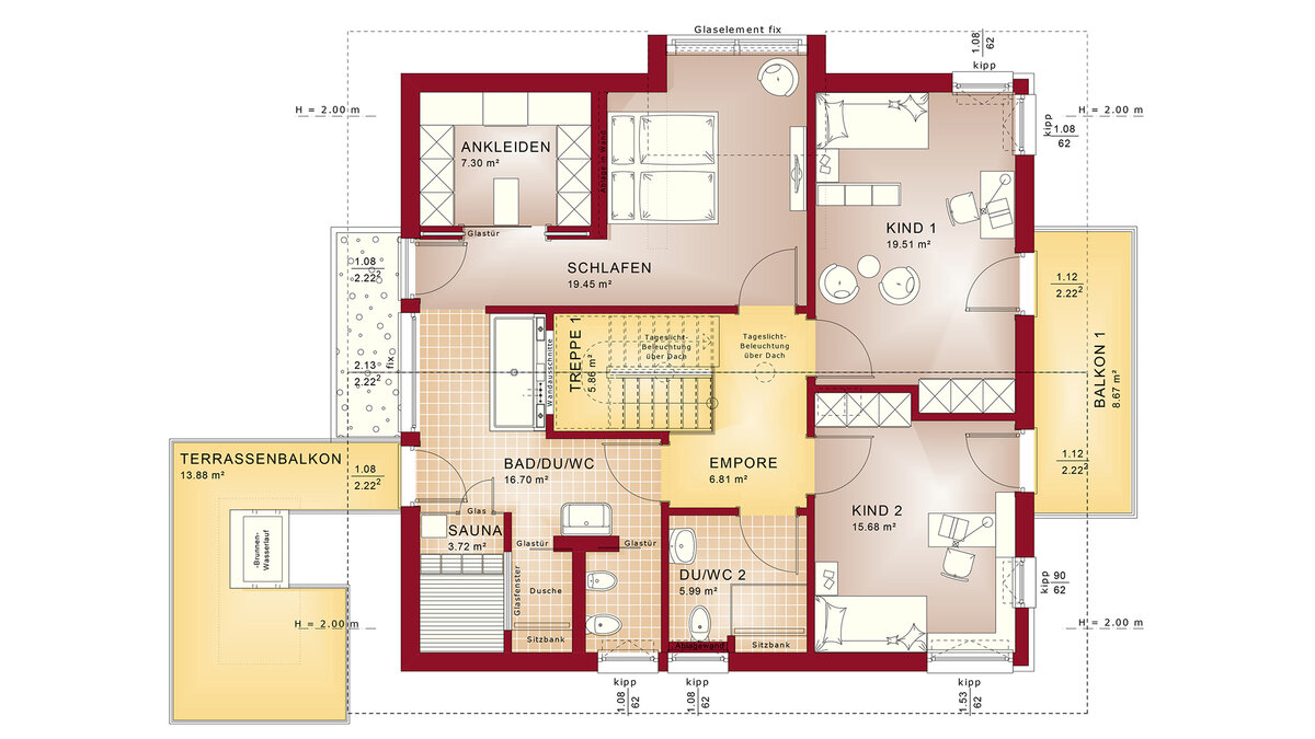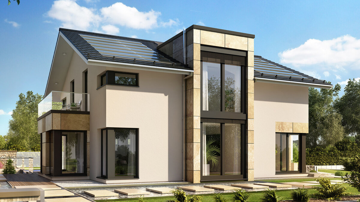 Das CONCEPT-M 163 ist die konsequente Weiterentwicklung der Idee, ein Haus zu kreieren, das bei der Realisierung individueller Wohnwünsche neue Maßstäbe setzt. Der elegante Baukörper wirkt mit seiner Kombination aus bodentiefen Fensterelementen im Erd- und Obergeschoss und zusätzlichen schlanken Fenster-Bändern im Obergeschoss harmonisch und klar. Das große Glas-Design Querhaus mit Flachdach an der Traufseite ist ein markantes Element und bringt im Inneren des Hauses neben zusätzlichem Raumgewinn vor allem ein fantastisches Tageslicht. Zusätzlichen Raum schafft auch der große Erker mit Balkon, der im Erdgeschoss den Essbereich erweitert und im Obergeschoss als Balkon für die beiden Kinderzimmer dient.