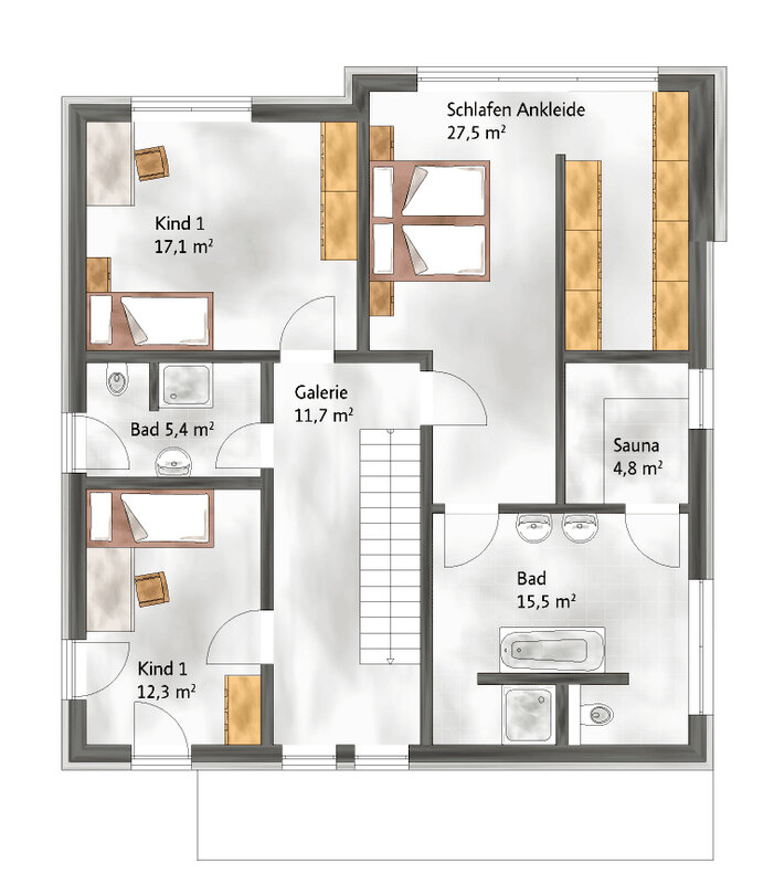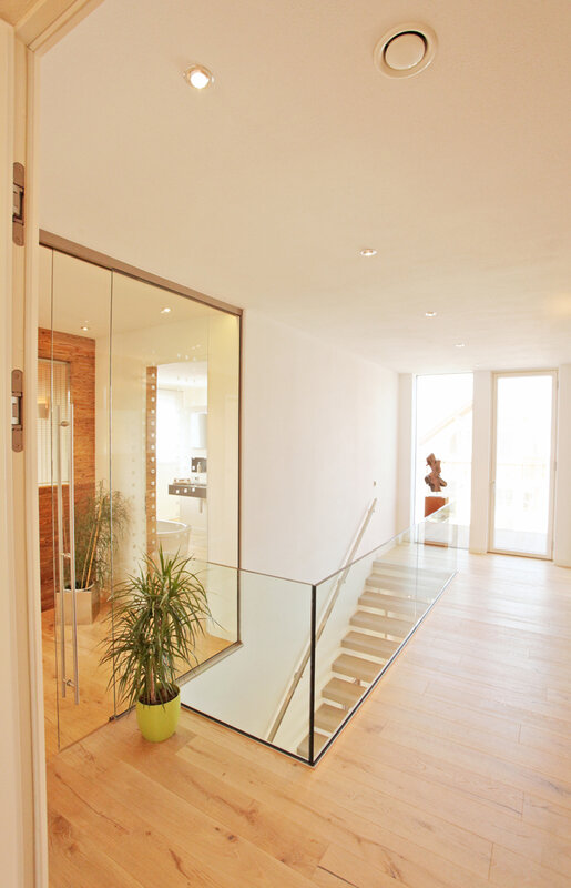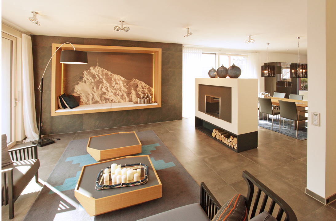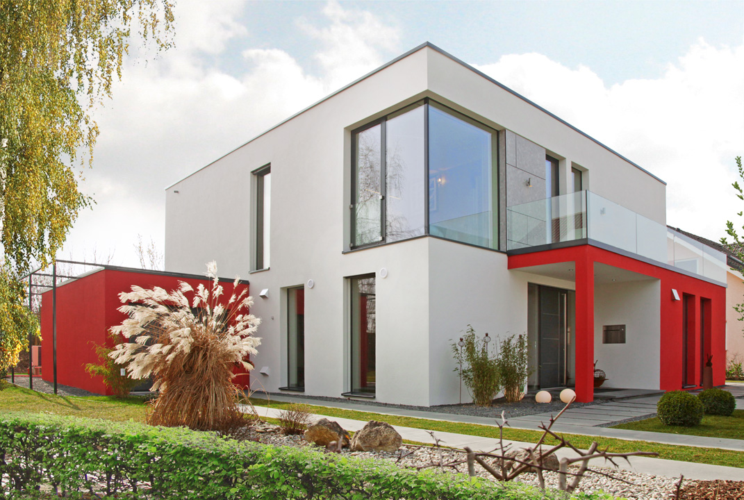 Das Haus in massiver Ziegelbauweise mit den im Werk vorgefertigten Ziegelelementen überzeugt durch ein angenehmes Raumklima. Der moderne Cubusstil mit hochwertiger Ausstattung wird durch energetische Vorteile wie Effizienzhaus 55 nach EvEV 09 mit Lüftungsanlage sowie Wärmepumpe mit Solaranlage noch aufgewertet. Viel Platz zum Leben bietet der offen gestaltete Grundriss. Die Highlights des Musterhauses sind unter anderem eine freischwebende Treppe durch einseitig eingestemmte Stufen und Glasfront im Geländerbereich, ein großer Wellnessbereich mit Sauna oder auch die großen, fast rahmenlosen Fensterfronten. Eine Besonderheit bietet auch die Ziegelklimadecke zum Heizen und Kühlen.