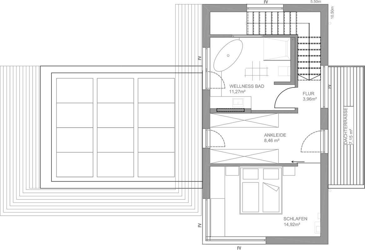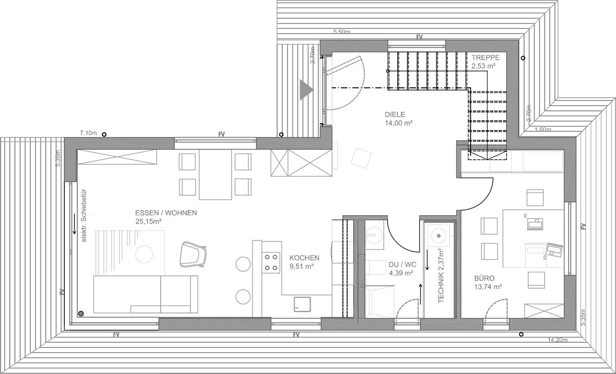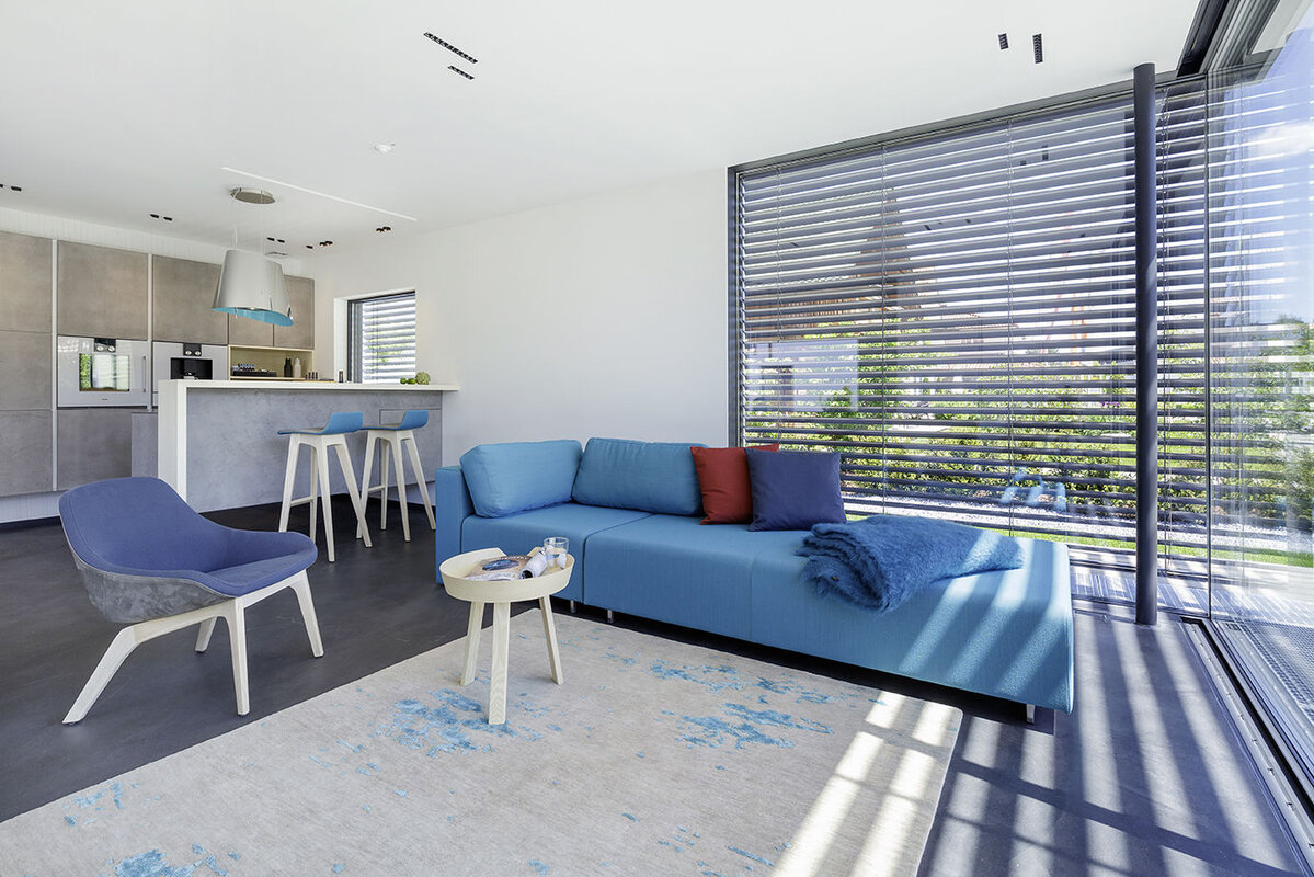 In großzügiger Offenheit erstreckt sich das Flachdachhaus über zwei Geschosse. Mit intelligenten Raumaufteilungen und geschickt auf die täglichen Bedürfnisse abgestimmten Einbaumöbeln nutzt das Konzept die Wohnfläche optimal. Eine durchgängige, auf das Wesentliche reduzierte Design- und Formensprache erzeugt ein harmonisches Raumgefühl und eine einzigartige Wohlfühlatmosphäre.