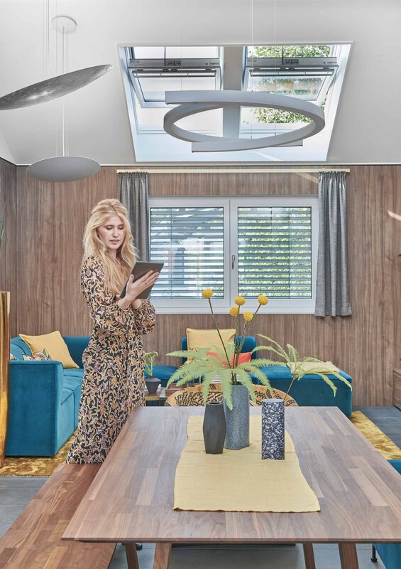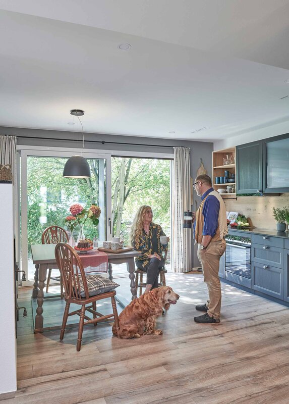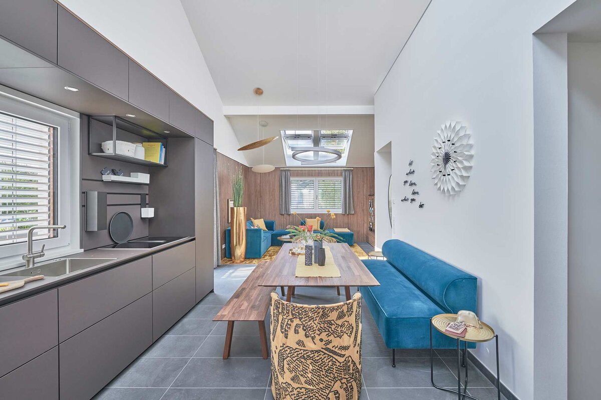 Im benachbarten Zweifamilienhaus sind die beiden Wohneinheiten durch ein geschlossenes Treppenhaus separat erreichbar. Optimal nutzbar für einen 2-Personen-Haushalt mit viel Raumerlebnis, ist die Comfort-Wohnung mit 74 m² im Erdgeschoss. Die maßgeschneiderte Einrichtung aus der Schwörer Design-Schreinerei sorgt für einen andauernden Blickfang.