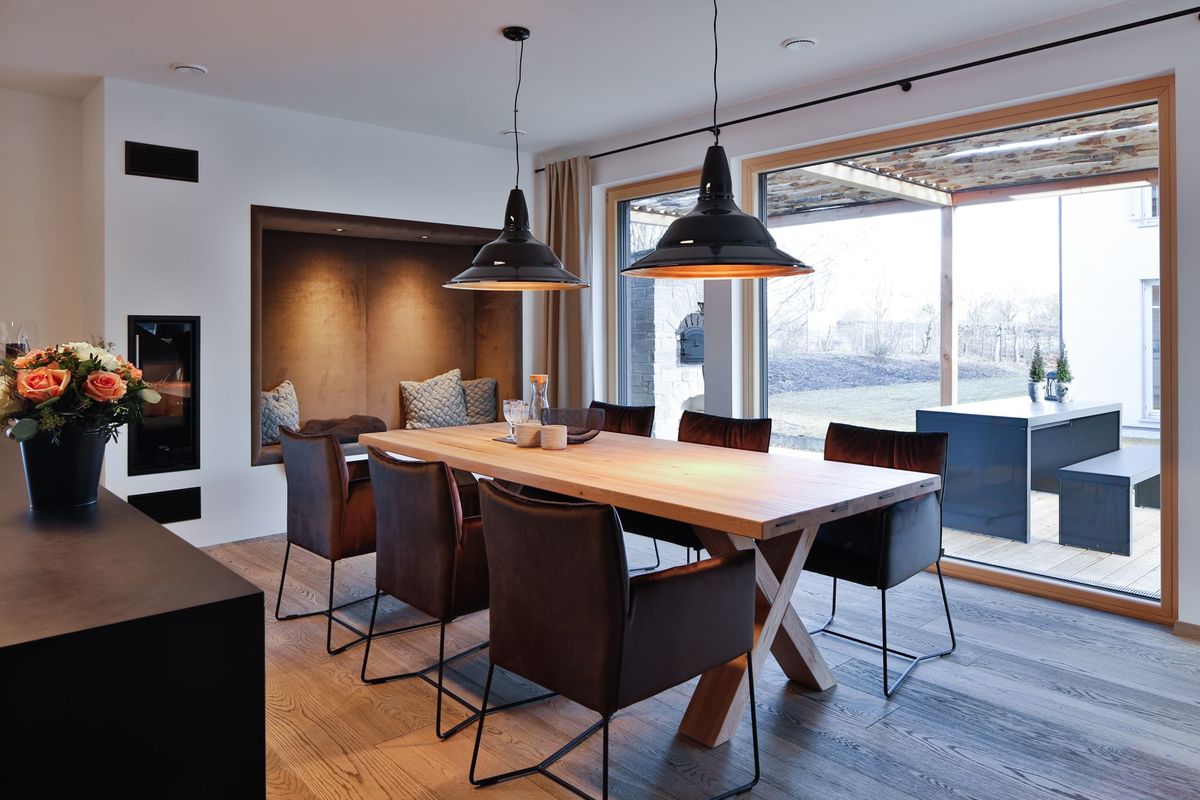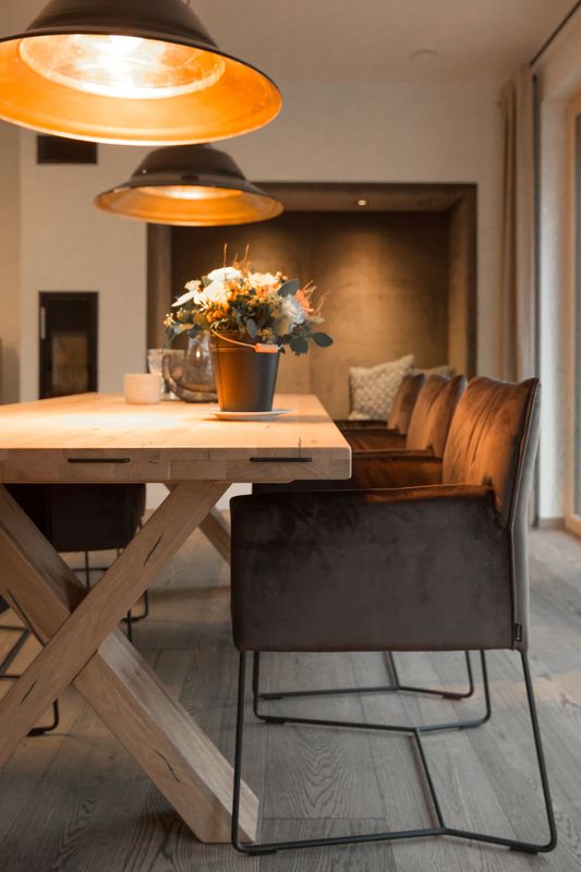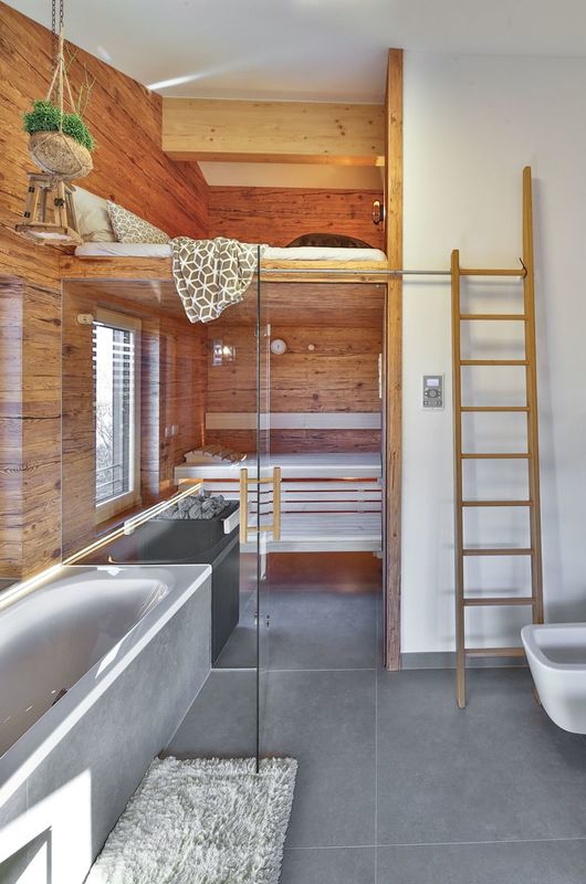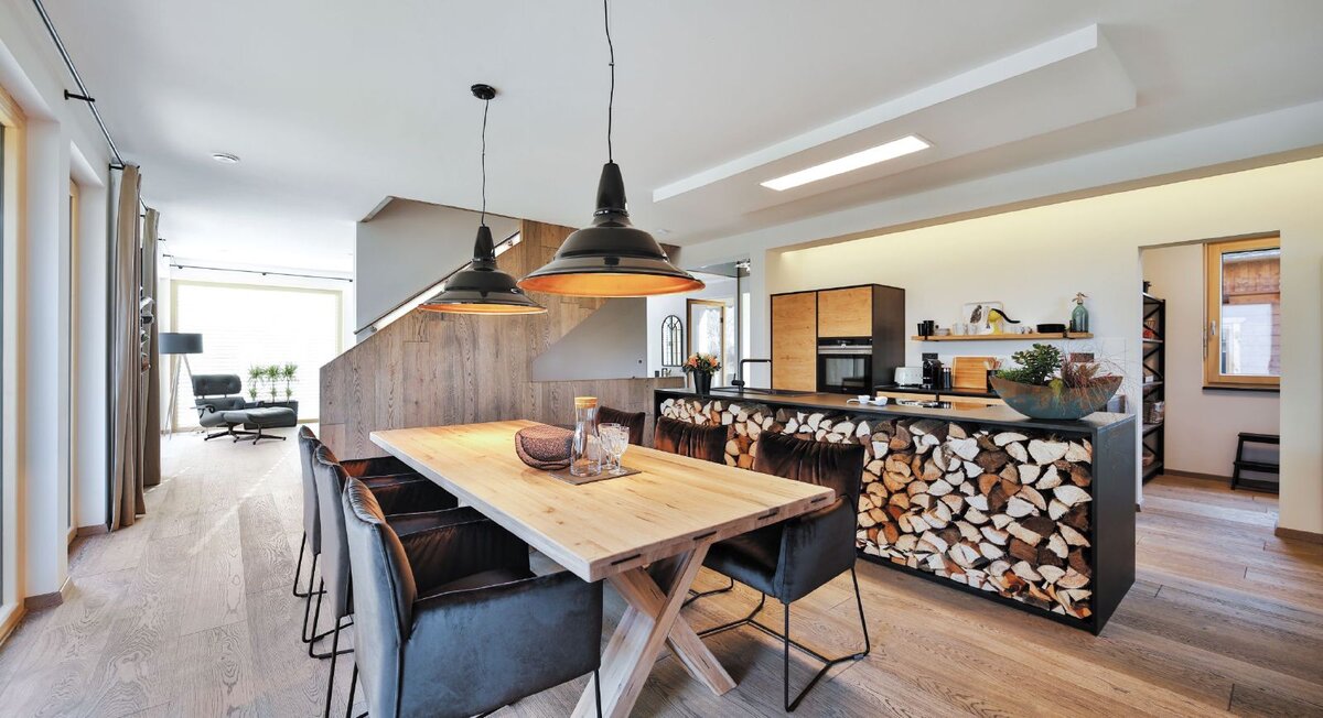 Auch drinnen kombiniert Heidi zukunftsweisende Technik mit uriger Gemütlichkeit. Smart-Home-Steuerung, Wellness-Bad mit Privatsauna und ein moderner Kaminofen sorgen für Komfort. Innenarchitektonische Details wie falzlose Holztüren mit Magnetschnappern, die dunkle Lackspanndecke in der Diele, die vom Schreiner handgefertigte Holzküche mit Eiche-Vollholz-Schubladen und der rustikalen Holzlege davor oder die Terrasse mit dem Pizzaofen und der aus Baumstämmen gezimmerten Pergola verleihen das Gefühl, zuhause – im ganz privaten Urlaubsdomizil – angekommen zu sein.