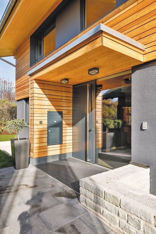 Die Architektur des Gebäudekörpers erinnert an die luxuriöse Großartigkeit eines ebenso schlichten wie mondänen Chalets. Die filigrane Untersicht des sich außerhalb des Gebäudes verjüngenden Vitaldachs harmoniert bestens mit der eleganten Lärchenholzschalung im Obergeschoss der ansonsten anthrazitfarbenen Fassade. Asymmetrisch verteilte Fenster und Tecturaplatten zwischen den Fenstern setzen gezielte Akzente. Indirekte LED-Beleuchtung setzen das Erdgeschoss der Eingangsfront und die Eingangstür nachts in Szene und erhöhen das Sicherheitsgefühl.
