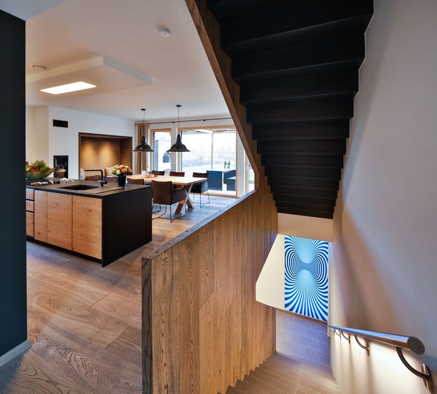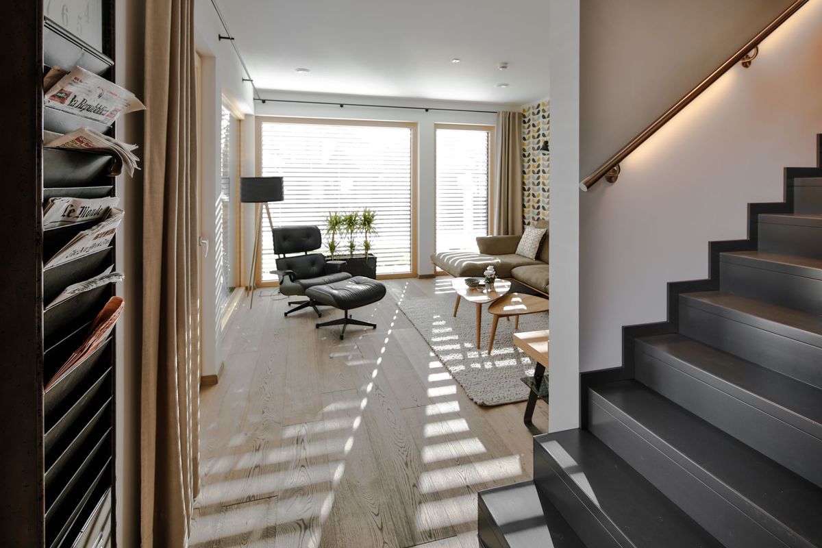 Für energetischen und persönlichen Komfort sorgen unter anderem die Proxon Frischluftwärmetechnik mit der Luft-/Luft-Wärmepumpe mit integrierter Trinkwasserwärmepumpe, das Photovoltaik-Solarsystem und der moderne Plewa Kaminofen sowie die Hausautomation, mit der die Heizung ebenso reguliert werden kann wie die Beleuchtung und auf Wunsch eine Alarmanlage.