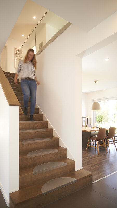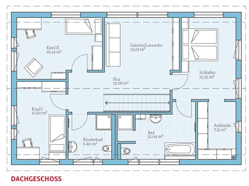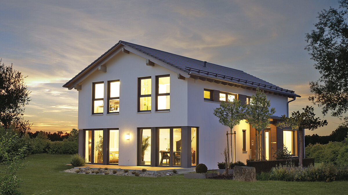 Das Musterhaus Variant 25-192 in München-Poing ist eine moderne Interpretation der klassischen (ober-) bayerischen Bauform. Aber nicht nur dort macht diese Architektur eine gute Figur: Mit seinem 2 m hohen Kniestock und dem flachen 25°-Satteldach ist der Entwurf ideal für Gegenden geeignet, in denen Baugrund teuer ist und dennoch, auch ohne Keller, viel Wohnfläche geschaffen werden soll. Auf mehr als 190 m2 finden neben dem offenen Wohn-, Ess- und Kochbereich mit Speisekammer, einem Arbeits- oder Gästezimmer mit Dusch-Bad auch zwei Kinderzimmer mit separatem Bad, ein Elternschlafzimmer mit eigener Ankleide und Wellness-Bad ihren Platz. Und wird – jetzt oder auch erst später – ein Raum mehr benötigt, kann die Galerie im Obergeschoss zu einem weiteren Zimmer umfunktioniert werden.