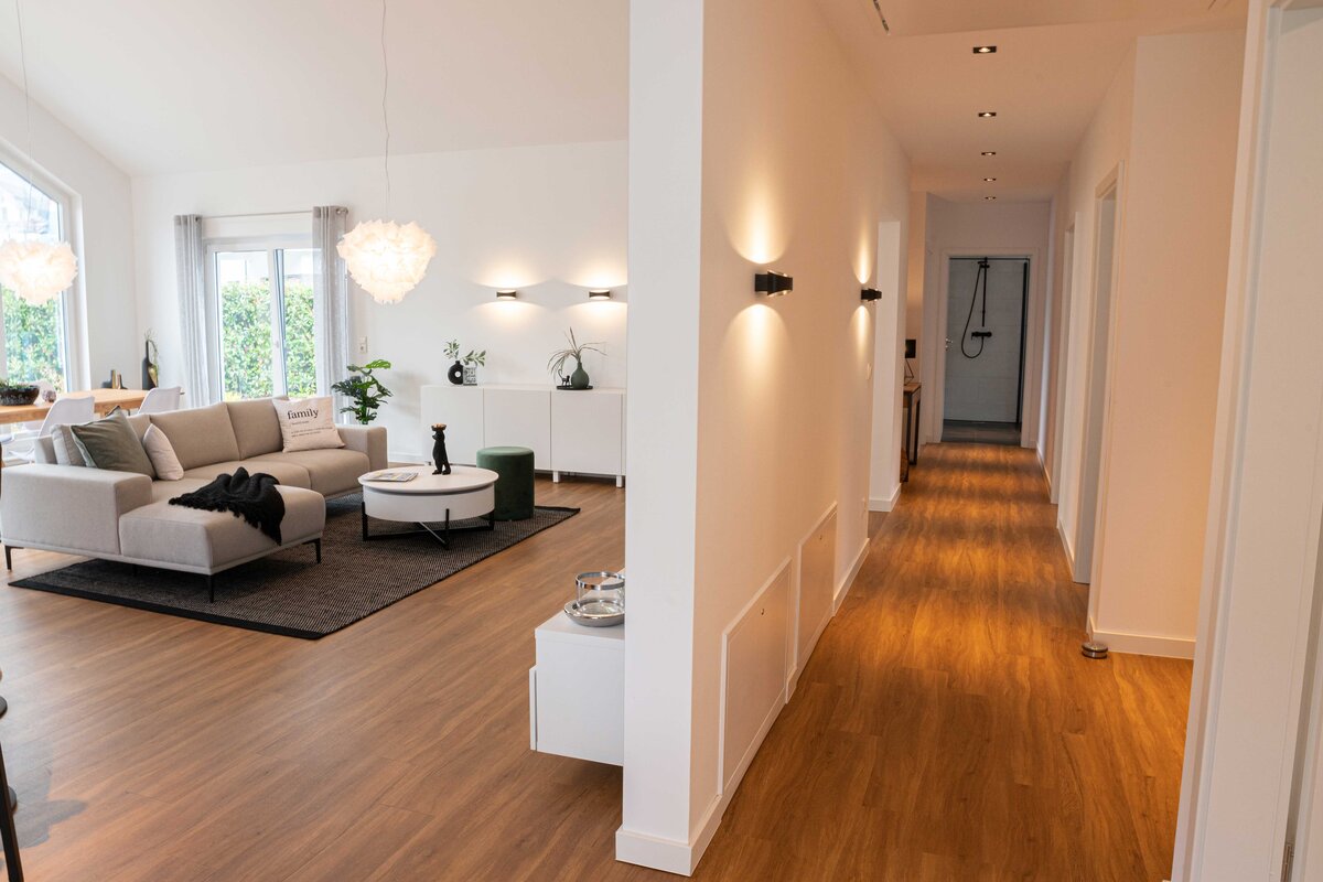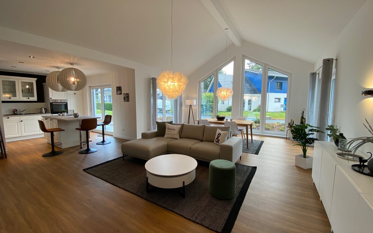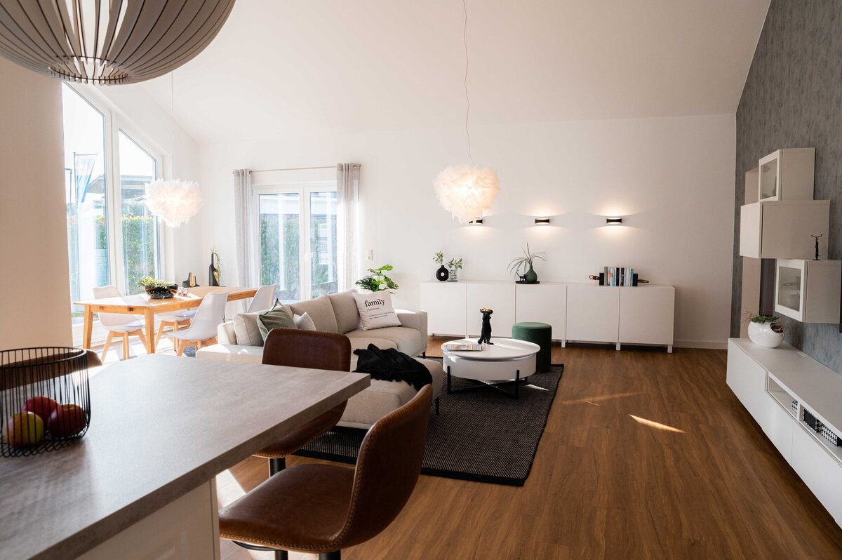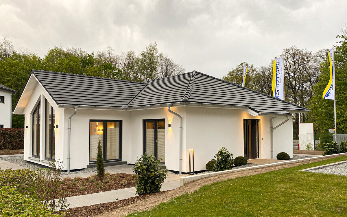 Dieser Winkelbungalow ist einfach ein Hingucker: Durch eine Kombination aus Kathedraldecke und Panoramaverglasung im Wohn-/Essbereich entsteht ein beeindruckendes Raumgefühl mit faszinierendem Ausblick. Das barrierefreie Raumkonzept umfasst insgesamt vier Zimmer und wird ergänzt durch den überdachten Hauseingangsbereich und dem vergrößerten Dachüberstand. Welches Wohnkonzept zu Ihrem Lebensmodell passt, ist Ihre Entscheidung – ein beeindruckendes Wohnambiente ist hier garantiert!