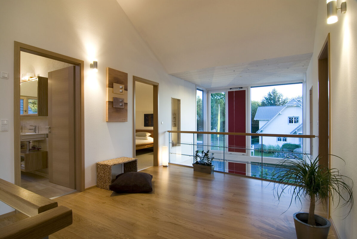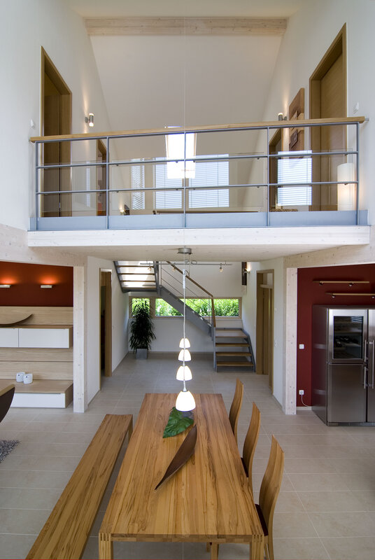 Hinter nachhaltig produzierten, atmungsaktiven und durch und durch ökologischen Fertigwänden verbergen sich lichte, offene Räume, die von reichlich natürlichem Licht durchflutet sind.