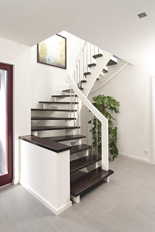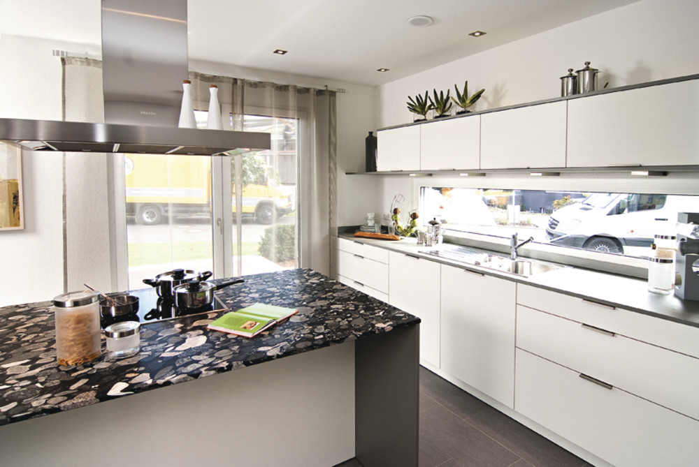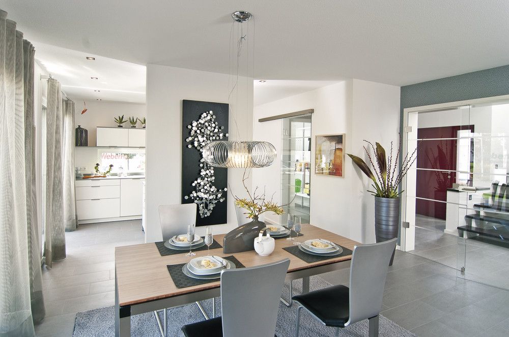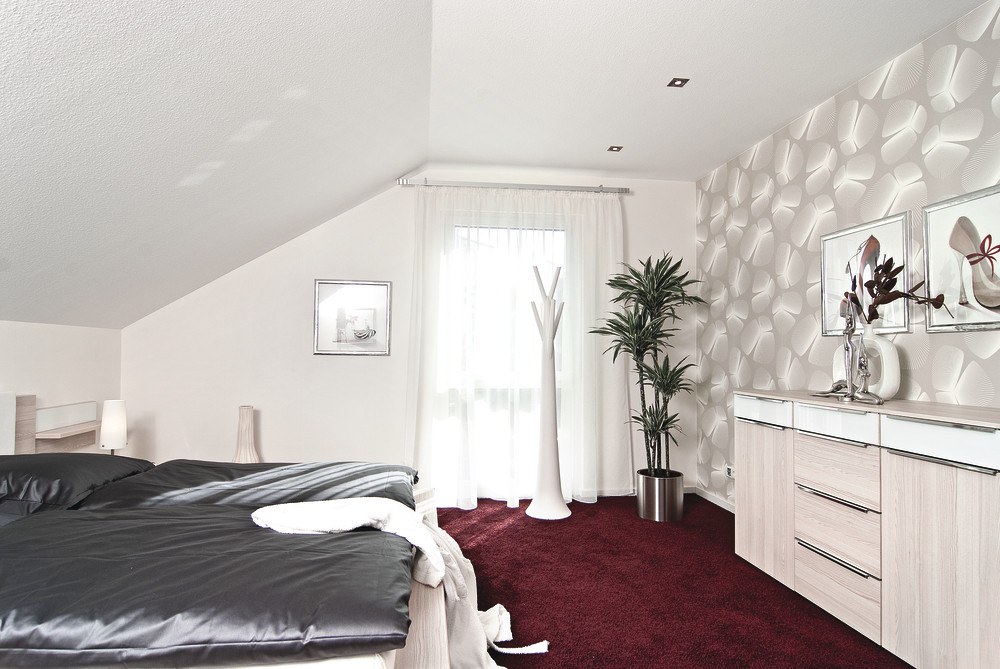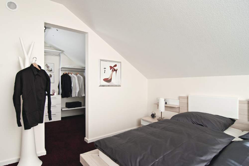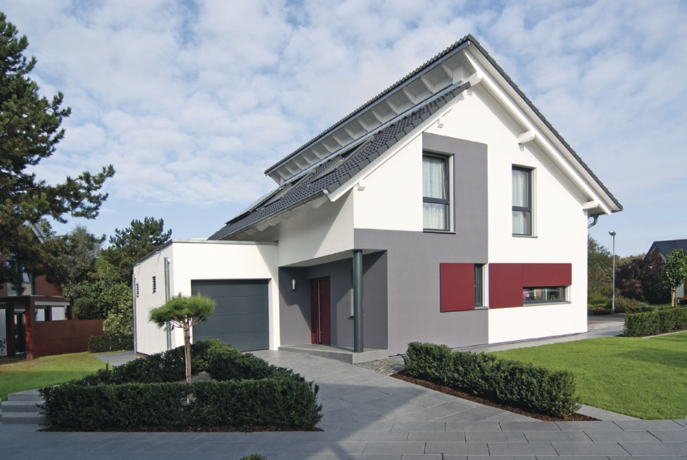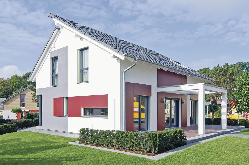 Das Ausstellungshaus in Bad Vilbel präsentiert sich auf über 155 qm Wohnfläche und zeichnet sich durch einen kompakten und funktionalen Grundriss aus. Das versetzte Pultdach und die weinroten Fassadenplatten geben dem Haus sein unverwechselbares Aussehen. Mit der überdachten Pergola wird die Terrasse zum zusätzlichen Zimmer im Grünen. Der Innenbereich punktet im Erdgeschoss mit einer geräumigen Diele und einem großzügigen Wohn-/Essbereich. Ein weiteres Zimmer kann als Gäste- oder Arbeitszimmer genutzt werden. Im Dachgeschoss bildet eine Empore den Zugang zu drei nahezu gleich großen Zimmern. Das Schlafzimmer verfügt zusätzlich über eine geräumige Ankleide. Das moderne Familienbad ist mit Dusche und Badewanne ausgestattet und überrascht mit einer pfiffigen Raumaufteilung.