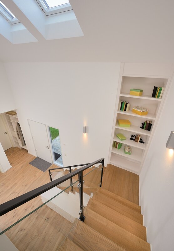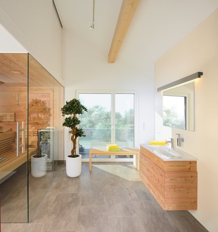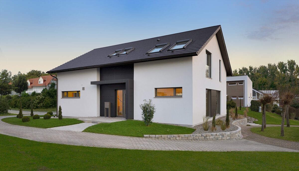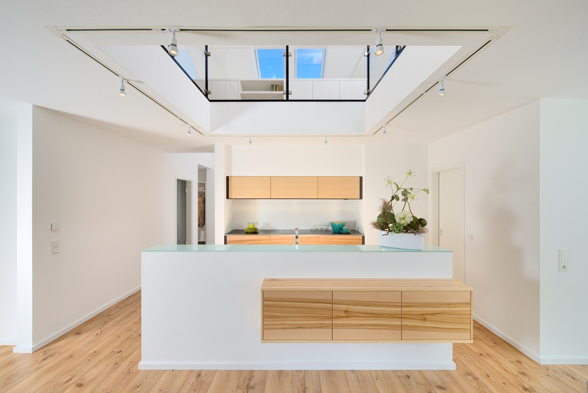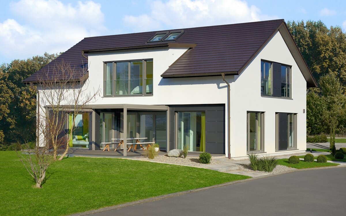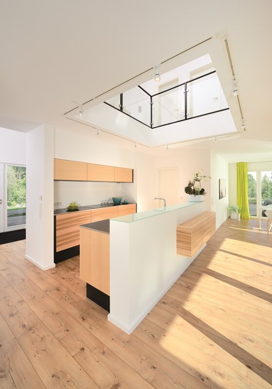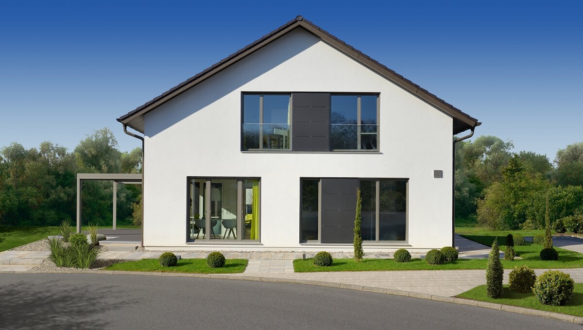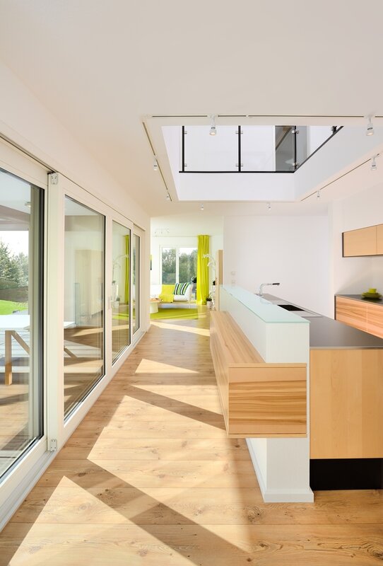 Mit dem Haus Bad Vilbel wird ein großzügiges Wohnhaus mit spannendem Grundriss vorgestellt. In der Mitte des EGs wurde ein frei stehender Küchenblock als Verbindung zwischen dem Wohn- und Essbereich platziert. Diese schließen links und rechts an und fassen den Teil der Terrasse ein, der vom Obergeschoss überdacht wird. Durch die großen Fenster entsteht so ein Übergang von innen nach außen. Neben Spülküche und Technikraum befinden sich im EG noch ein geräumiges Arbeitszimmer, sowie ein Gäste-WC. Über die offene Diele gelangt man in das bis zum Dach freie OG, welches ausreichend Wohnfläche für zwei Kinder, ein Wellness-Bad und dem Elternschlafzimmer mit Ankleide bietet.