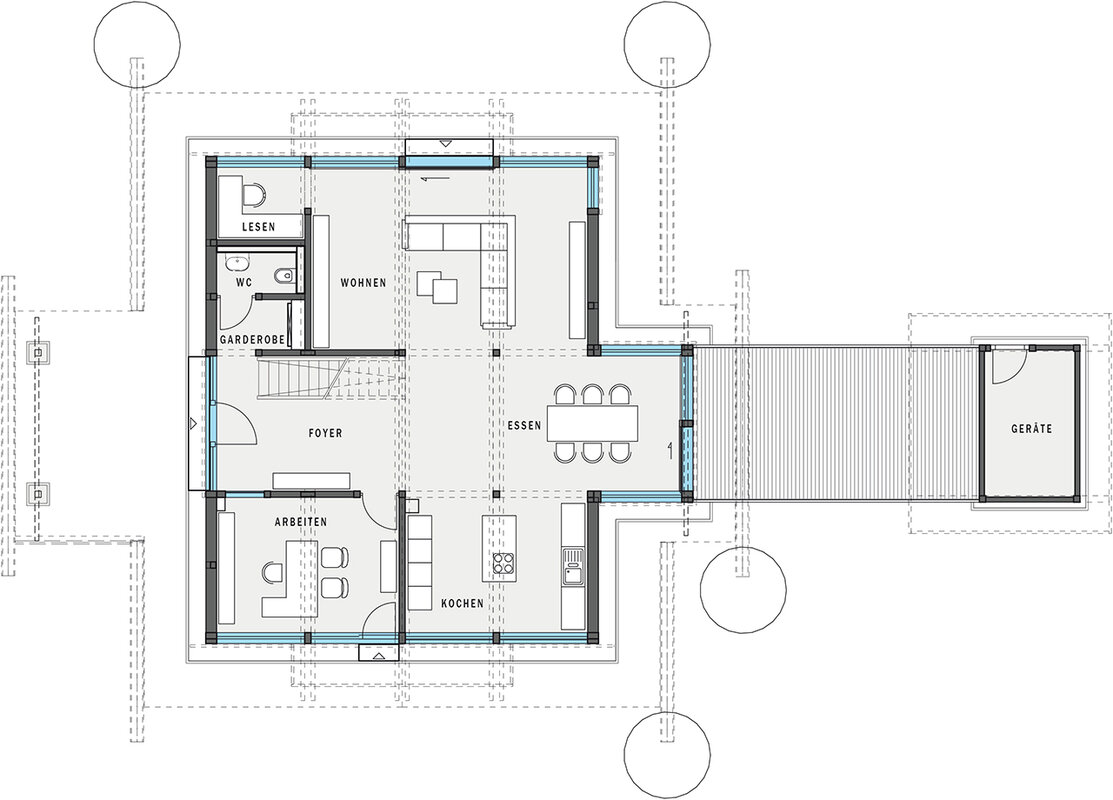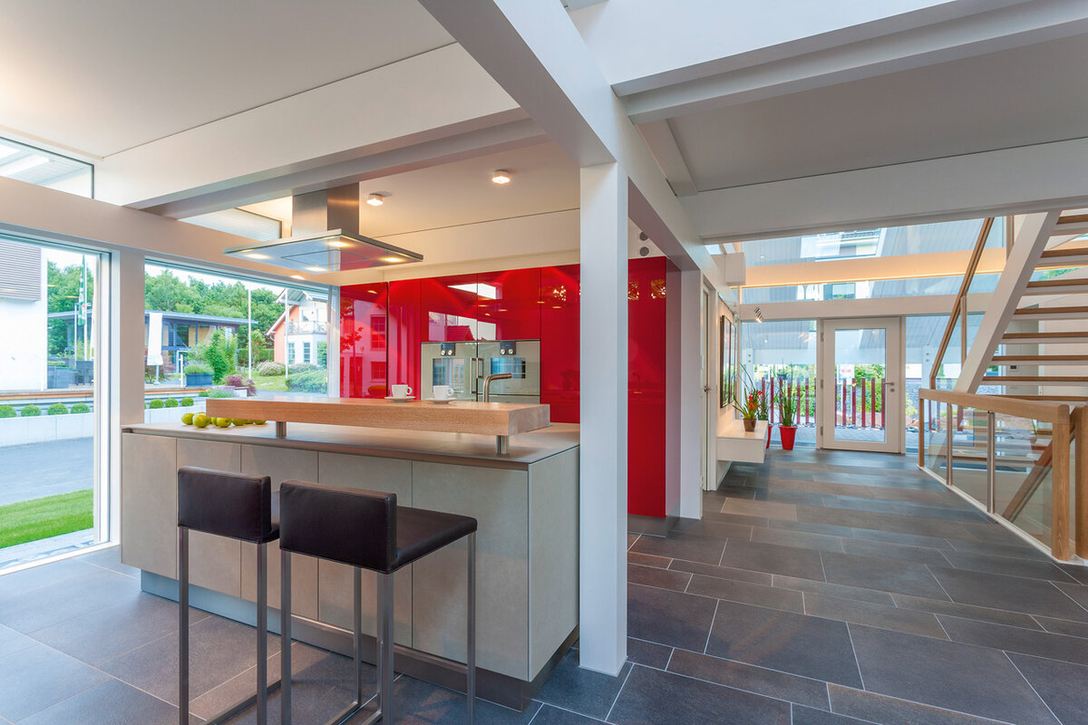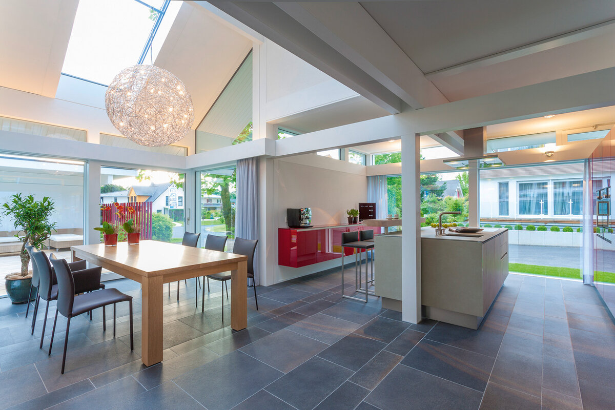 Schon das gläserne Eingangsportal gibt den Blick auf die faszinierende HUF Fachwerkarchitektur frei, die den Charakter des HUF Hauses ART 4 in der Ausstellung Bad Vilbel prägt. Im Inneren besticht die Geometrie der sichtbaren Holzkonstruktion im Wechselspiel des Tageslichts. Wohn-und Kochbereich sind so angeordnet, dass der Essplatz mit direktem Zugang zur Terrasse, Haus und Garten harmonisch verbindet. Im gläsernen Erker ist die Natur besonders spürbar –Sonne, Regen, Schnee oder Gewitter werden zum erlebbaren Naturschauspiel.