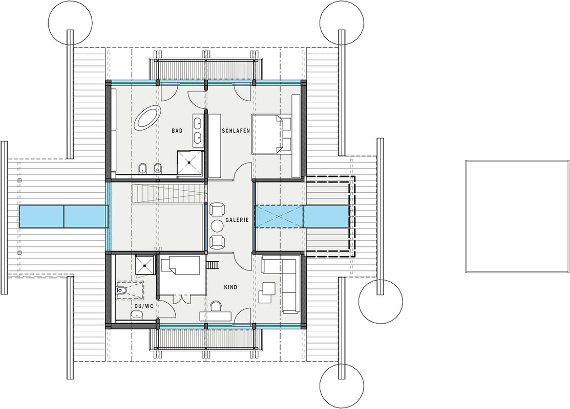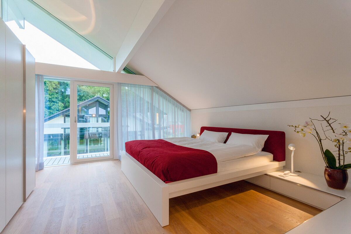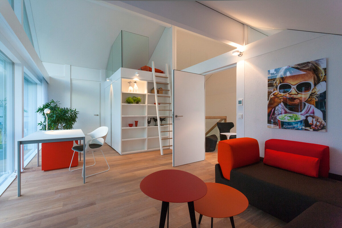 Im Obergeschoss dient eine offene Galerie als Brücke zwischen dem Elternbereich und der Kinder-und Gästesuite. Platz für zwanglose Geselligkeit bieten dort die Sitzlounge oder, bei entsprechendem Wetter, der Balkon. Ein pfiffiges Detail im Kinderzimmer: das Hochbett über der begehbaren Ankleide.