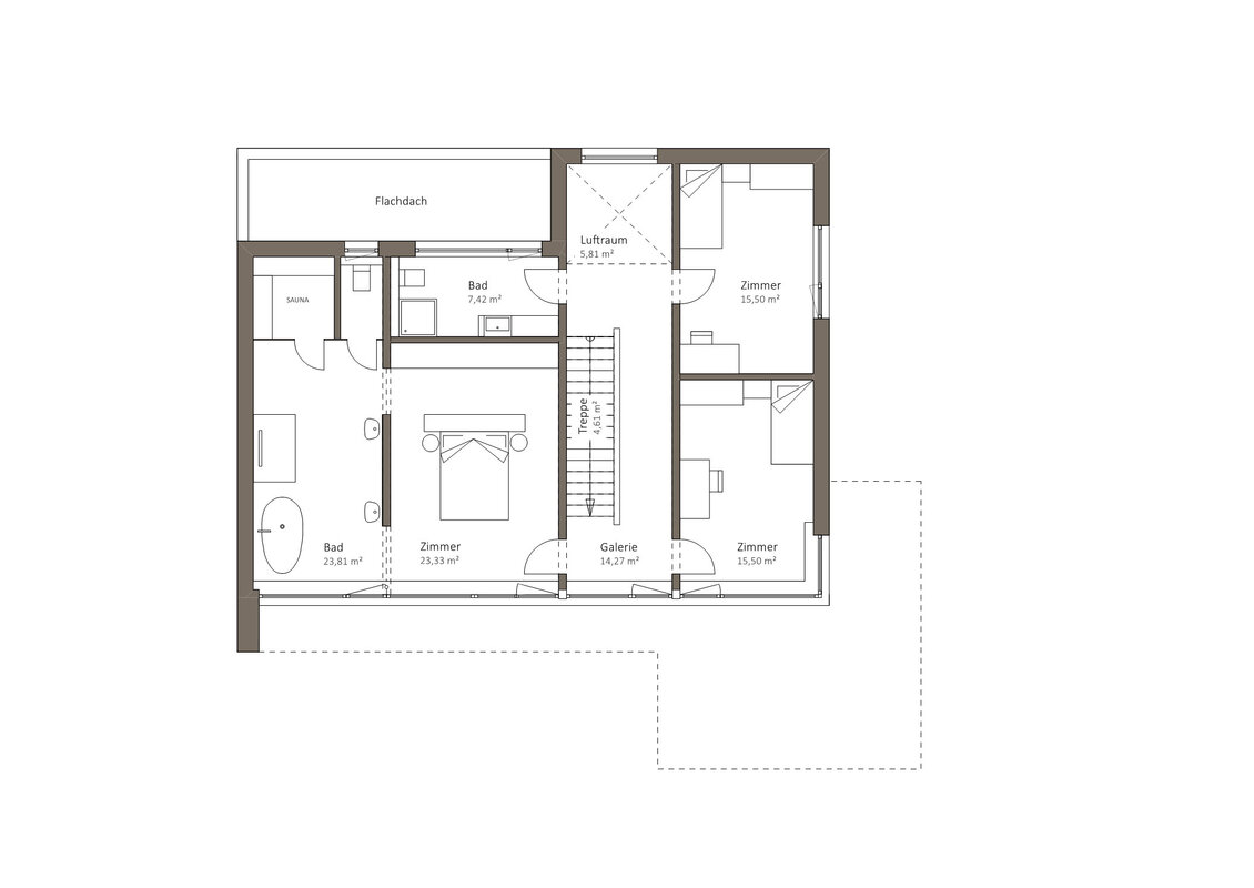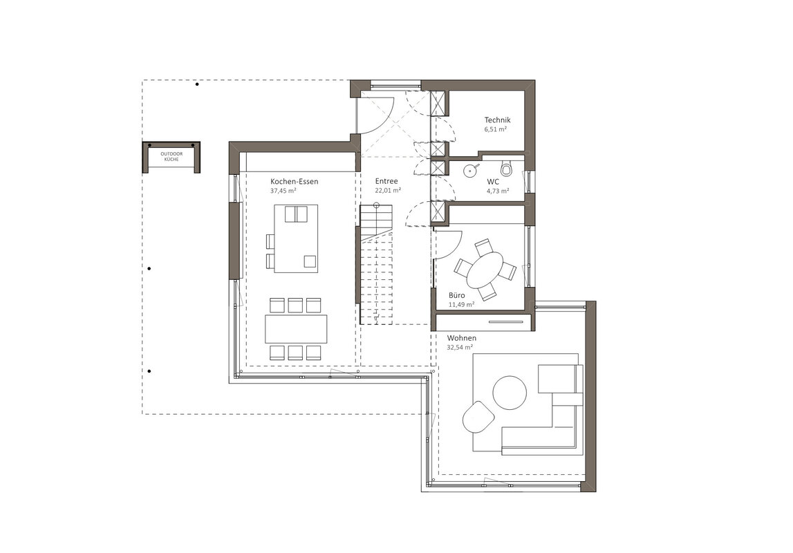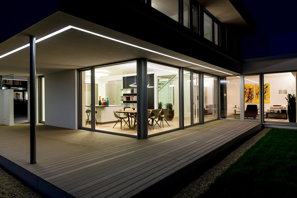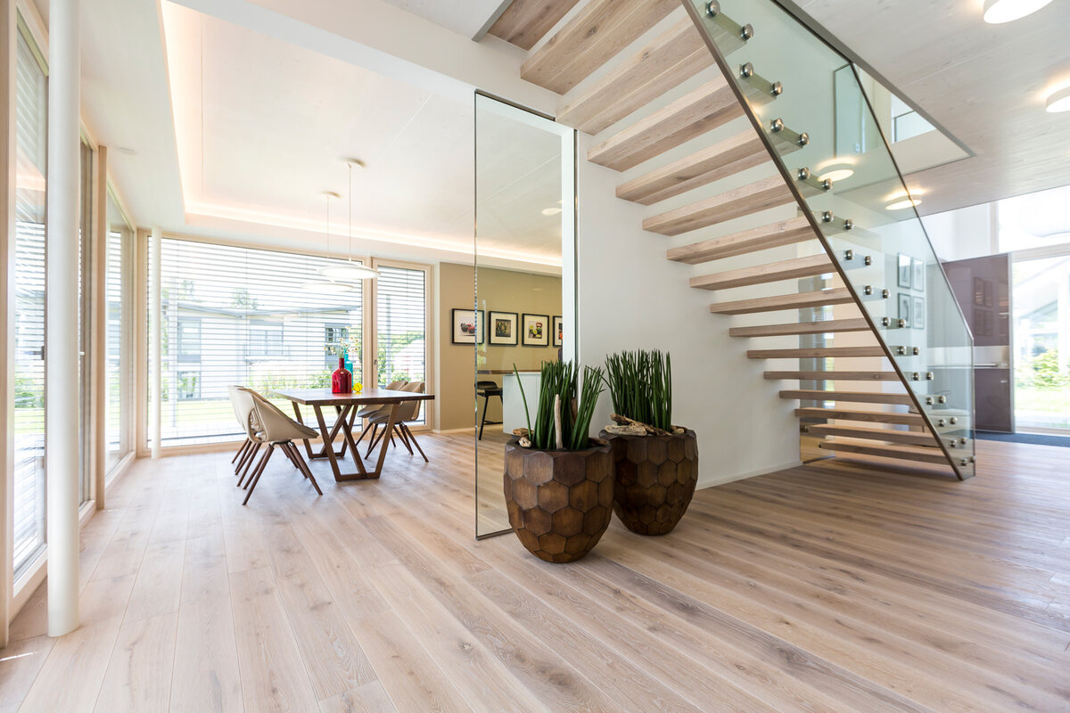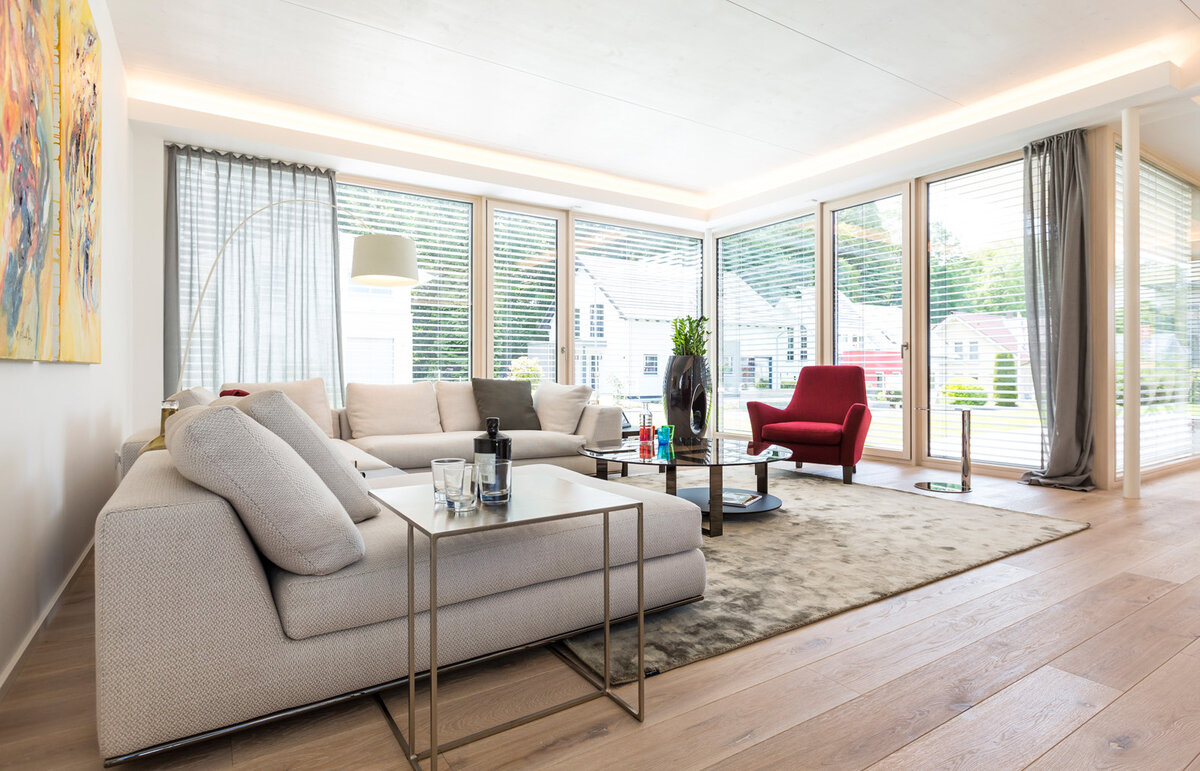 Dieses ELK Musterhaus trägt eine unverwechselbare Handschrift: Gradlinige Formen, große Fensterflächen und der Flachdachkubus sind charakteristisch für den modernen Bauhausstil. Die einzigartige Architektur in ökologisch nachhaltiger Holzbauweise ist geprägt durch das moderne und geradlinige Design. Hier steht vor allem Licht ,Leichtigkeit und höchster Wohnkomfort im Vordergrund. Blickfang sind die sowohl raumhohen als auch umlaufenden Fenster, welche durch ihre Großzügigkeit ein offenes Wohngefühl vermitteln.