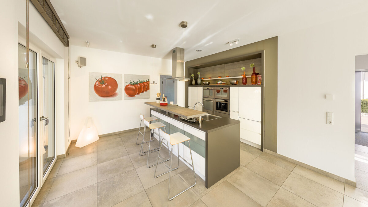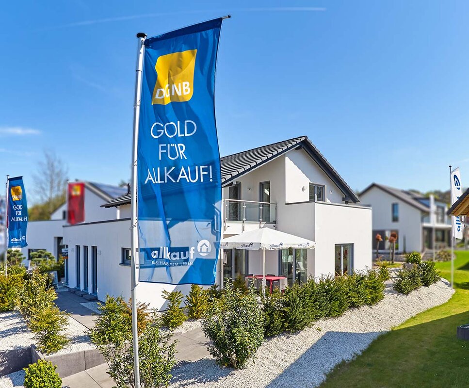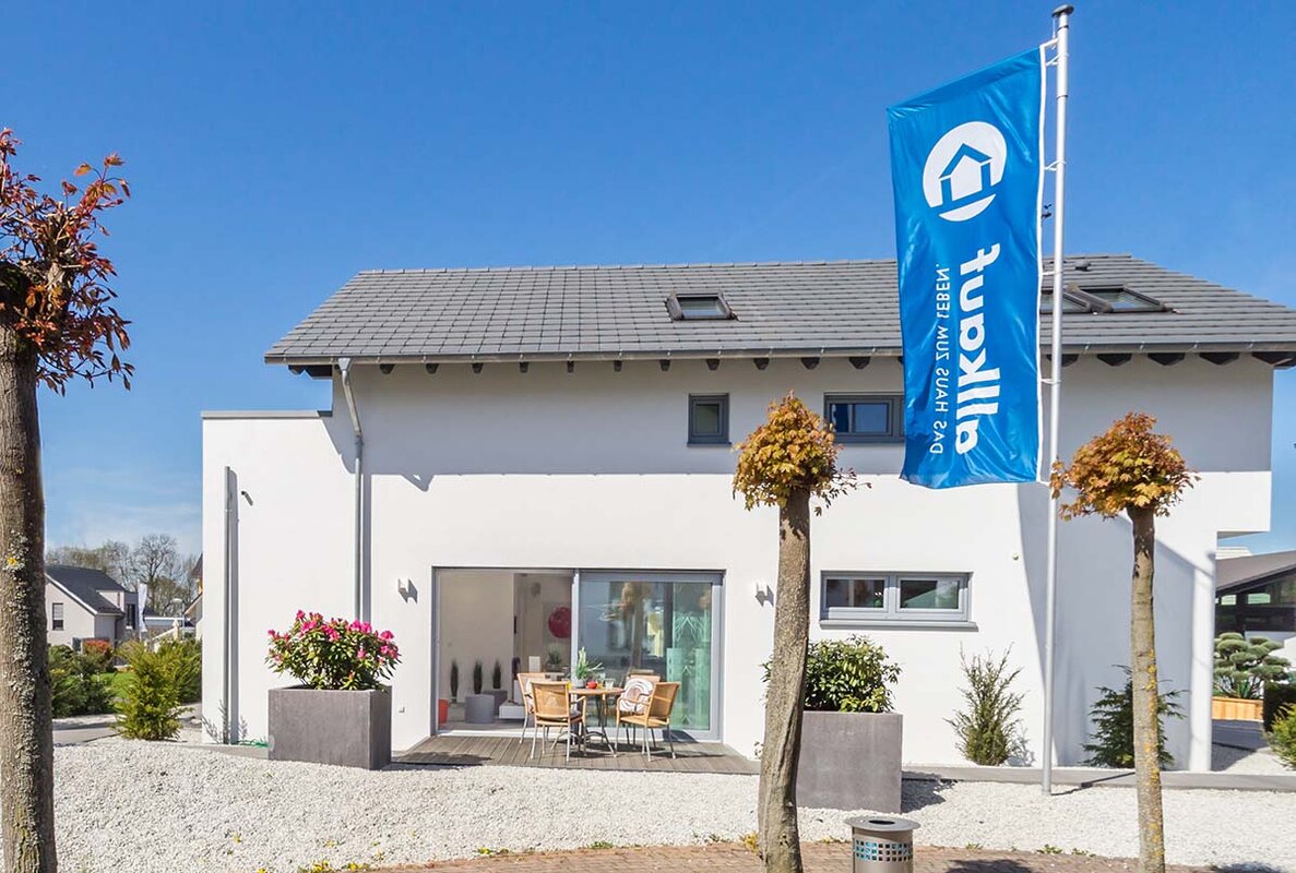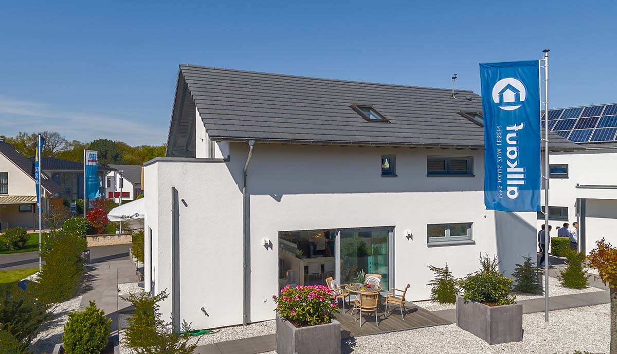 Großzügig, modern und energieeffizient sind nur einige Begriffe die das allkauf-Musterhaus in Bad Vilbel. beschreiben. Schon von außen betrachtet lässt sich erahnen dass es kein Haus ist wie jedes anderes. Das Anbauteil mit Flachdach wird perfekt mit dem zeitlosen Walmdach kombiniert und zeigt nur eine von vielen Möglichkeiten, die allkauf bietet um ein Haus individuell zu gestallten.