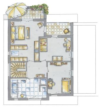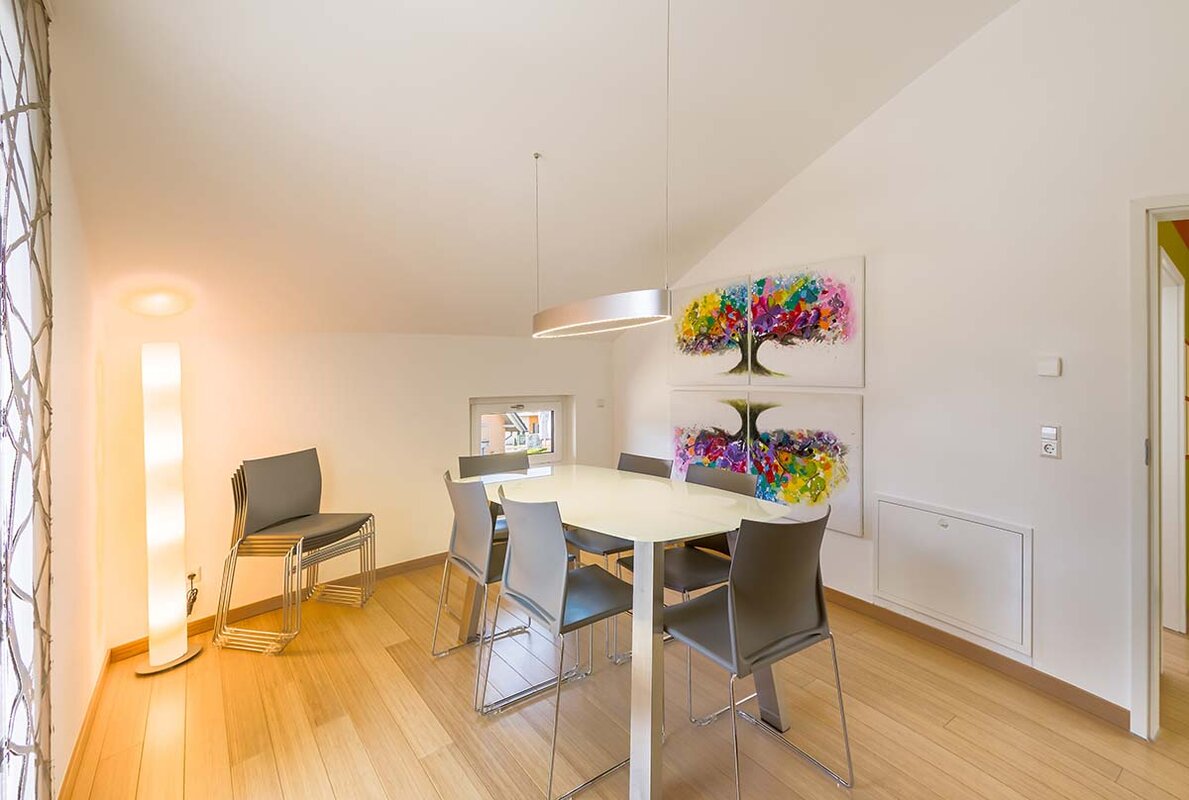 Große und offene Räume bieten jede Menge Platz und Entfaltungsmöglichkeiten für jeden Bewohner. Damit auch das Klima stimmt wurde eine kontrollierte Be- und Entlüftungsanlage mit Wärmerückgewinnung verbaut, die zusammen mit der Solaranlage und einer extra dicken Außendämmung dafür Sorge trägt, dass das Musterhaus den Titel Effizenzhaus tragen darf.