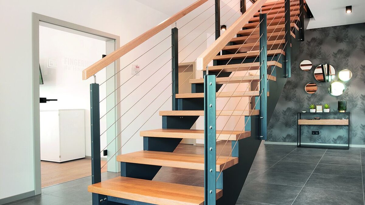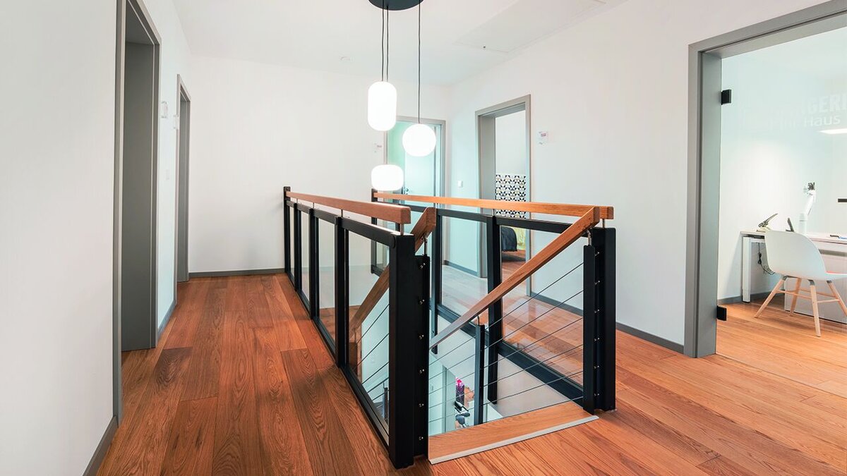 Und das Haus bietet weitere Highlights in diesem Stil: Der große repräsentative Eingangs-bereich mit Sicht auf die freitragende Treppe, die ins Dachgeschoss über die Galerie zu den oberen Räumlichkeiten führt, ermöglicht eine sinnvolle funktionale Teilung. Im Erdgeschoss liegen der Wohn- und Essbereich auf der einen Seite und ein Arbeitszimmer nebst Gäste-WC sowie der Hauswirtschaftsraum auf der anderen. Die Küche mit angrenzendem Abstell-raum ist an den Wohn-/Essbereich angeschlossen und liegt zwischen diesem und dem Hauswirtschaftsraum.