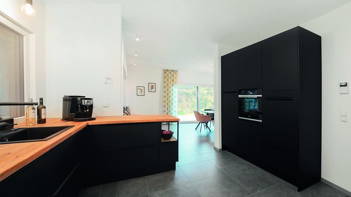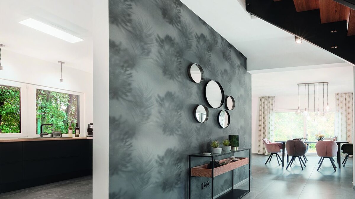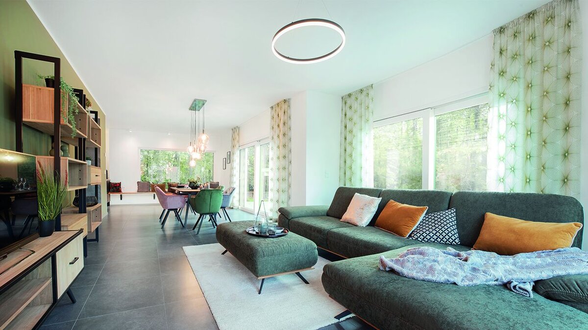 Es ist ein Spiel aus Offenheit und Geborgenheit in dem zweistöckigen Haus „Bad Vilbel“. Doch wer spielt hier mit wem? Wandscheiben und Wandöffnungen wechseln sich im eindrucksvollen Zentrum – dem 44,90 m² großen Wohn-/Essbereich – ab und vermitteln Freiheit, aber separieren dennoch den Raum. Durch diese raffiniert eingesetzten Elemente entsteht ein spannendes Wechselspiel aus offener Anmutung und gleichzeitiger Privat-sphäre. Große bodentiefe Fenster durchfluten den gesamten Wohn- und Esskomplex.