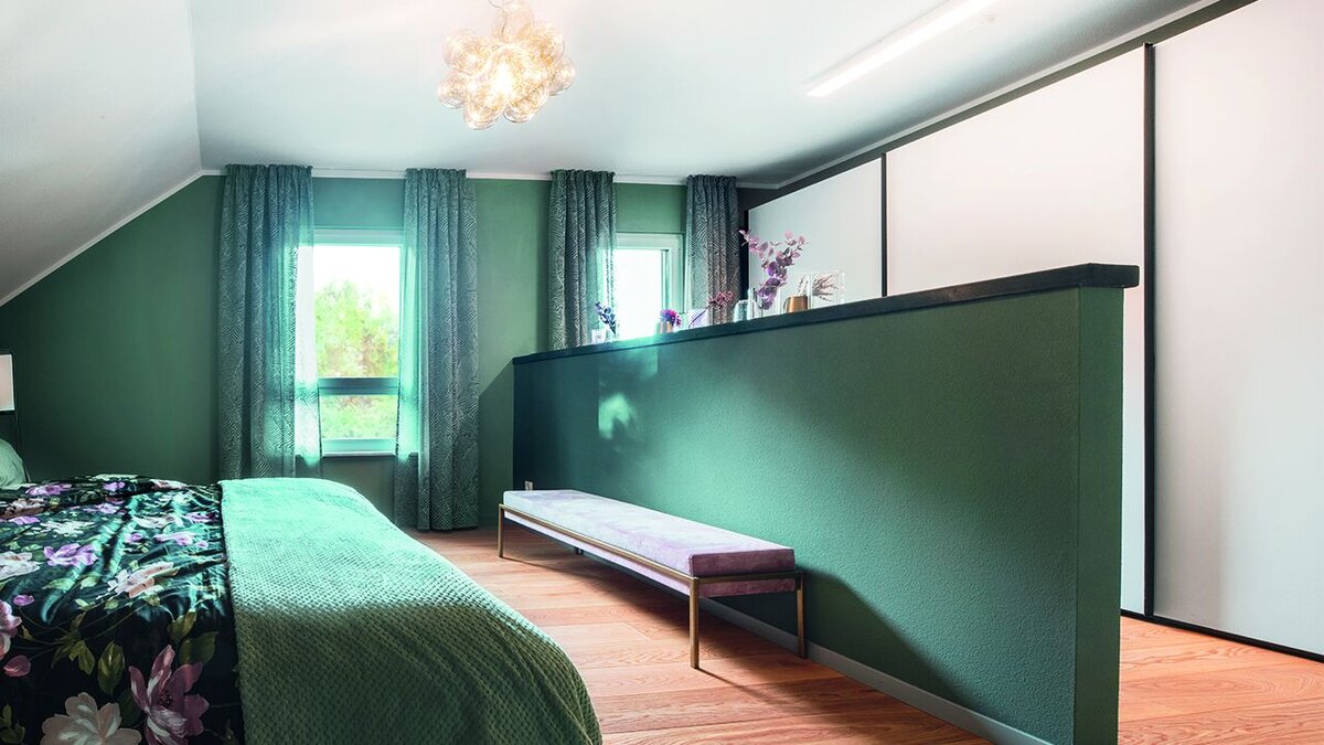 Im Dachgeschoss haben sowohl die Eltern als auch die Kinder durch diese geschickte Teilung ihr eigenes Refugium mit jeweils einem Bad.