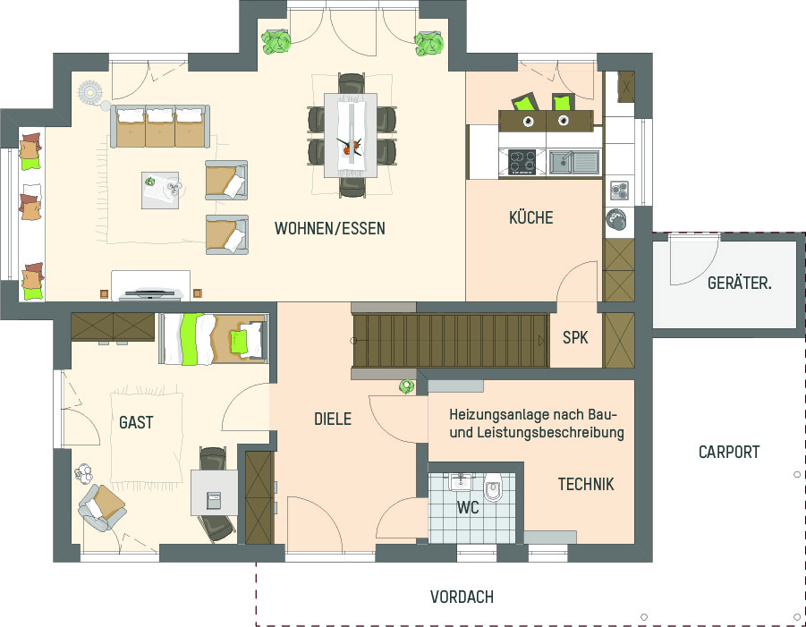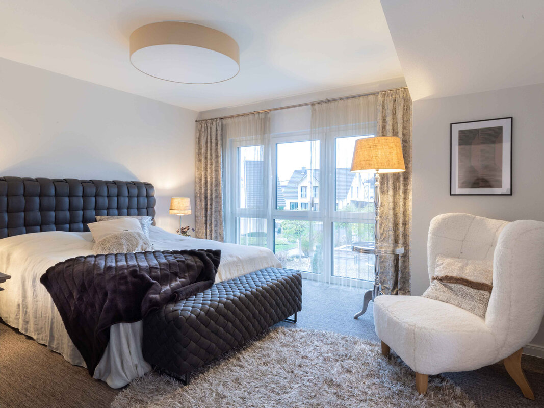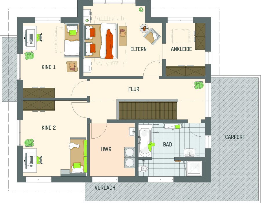 Das Dachgeschoss bietet eine Raumaufteilung mit einem gewissen Extra, denn der Hauswirtschaftsraum mit Waschmaschine und Trockner befindet sich im 2. Stock. So sind die Wege aus den beiden großzügigen Kinderzimmern und dem Elternschlafzimmer, mit einer En-suite-Ankleide, nicht mehr weit zur frischen Wäsche. Abgerundet wird die Etage durch das große Familienbad mit Badewanne und Wellness-Dusche im XL-Format.