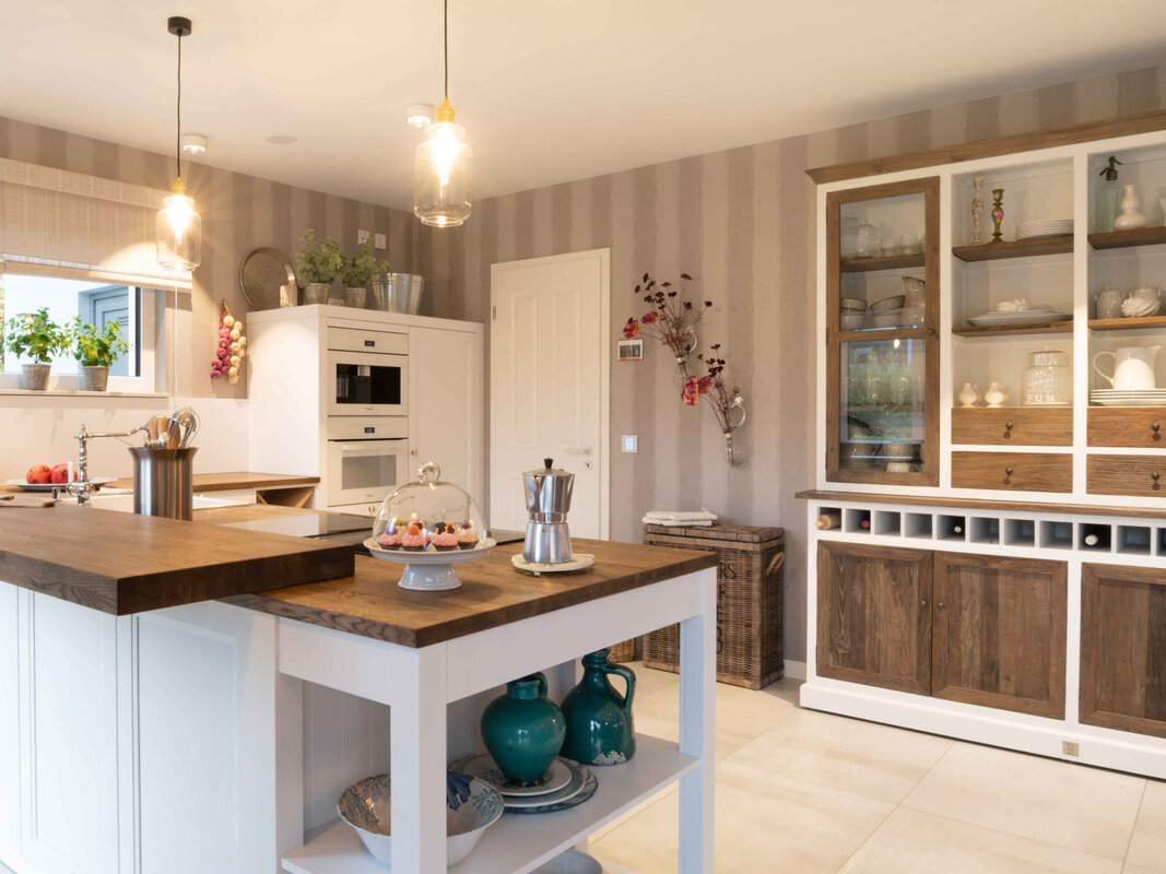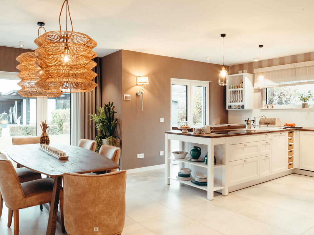 Beim Betreten des Musterhauses wird gleich deutlich: Die großzügige Wohnfläche versteckt sich nicht, man kann sie sofort wahrnehmen. Von der Haustür blicken Besucher über die Diele direkt ins Wohn-/Esszimmer. Der Verzicht auf eine Zwischentür vermittelt ein wunderbares Gefühl von Größe und Weite. An dem rustikalen Tisch aus dunklem Holz lässt sich wunderbar mit vielen Gästen speisen und der Blick nach draußen genießen. Die angrenzende Küche besitzt eine Arbeitsfläche mit direktem Gartenblick und einen schicken Kochtresen mit zwei Essplätzen für das schnelle Frühstück am Morgen oder den Nachmittags-Cappuccino.