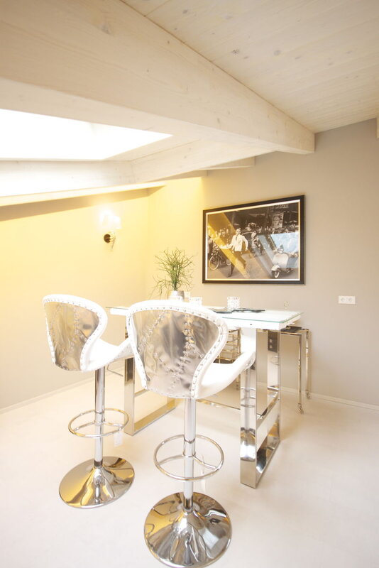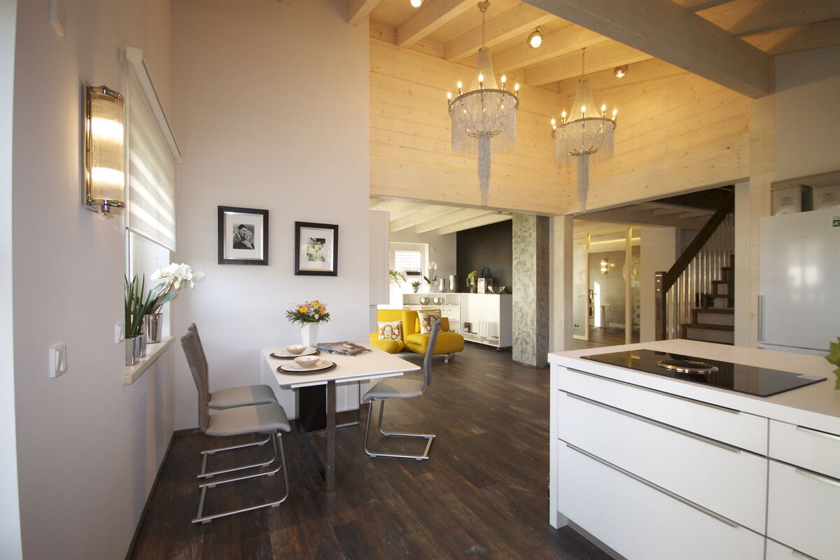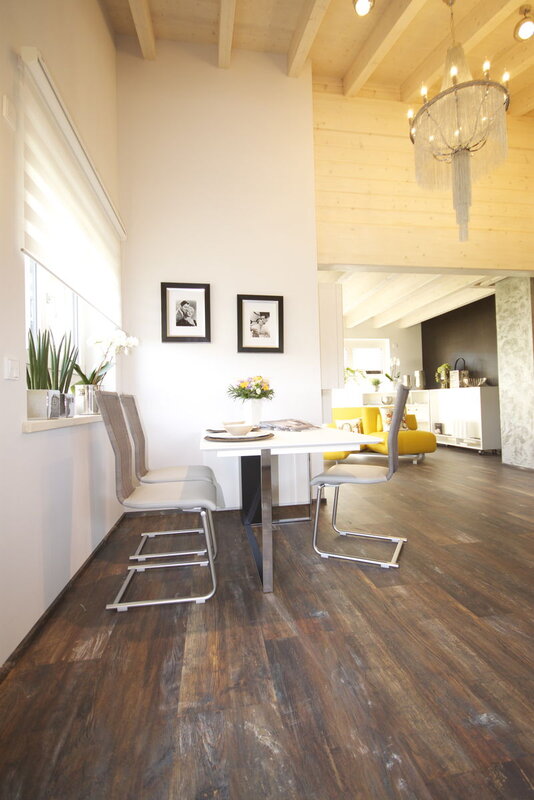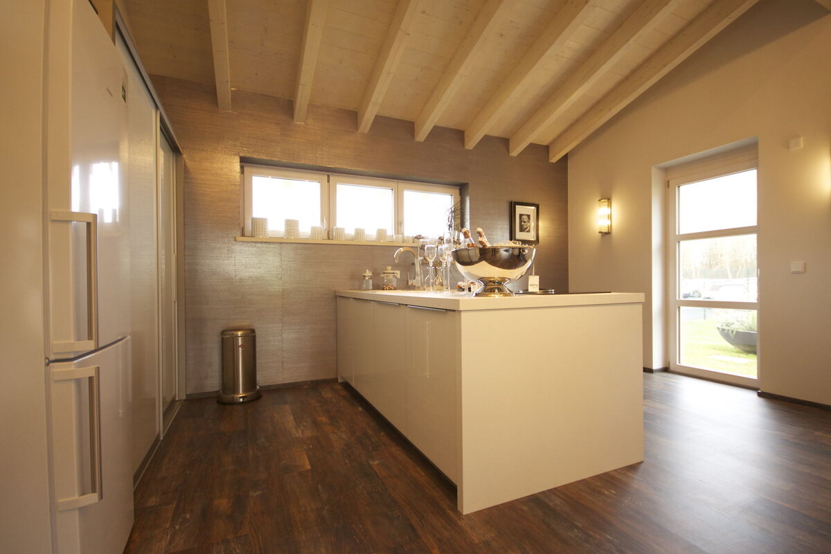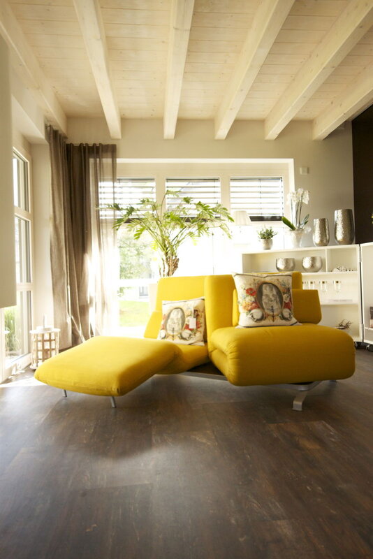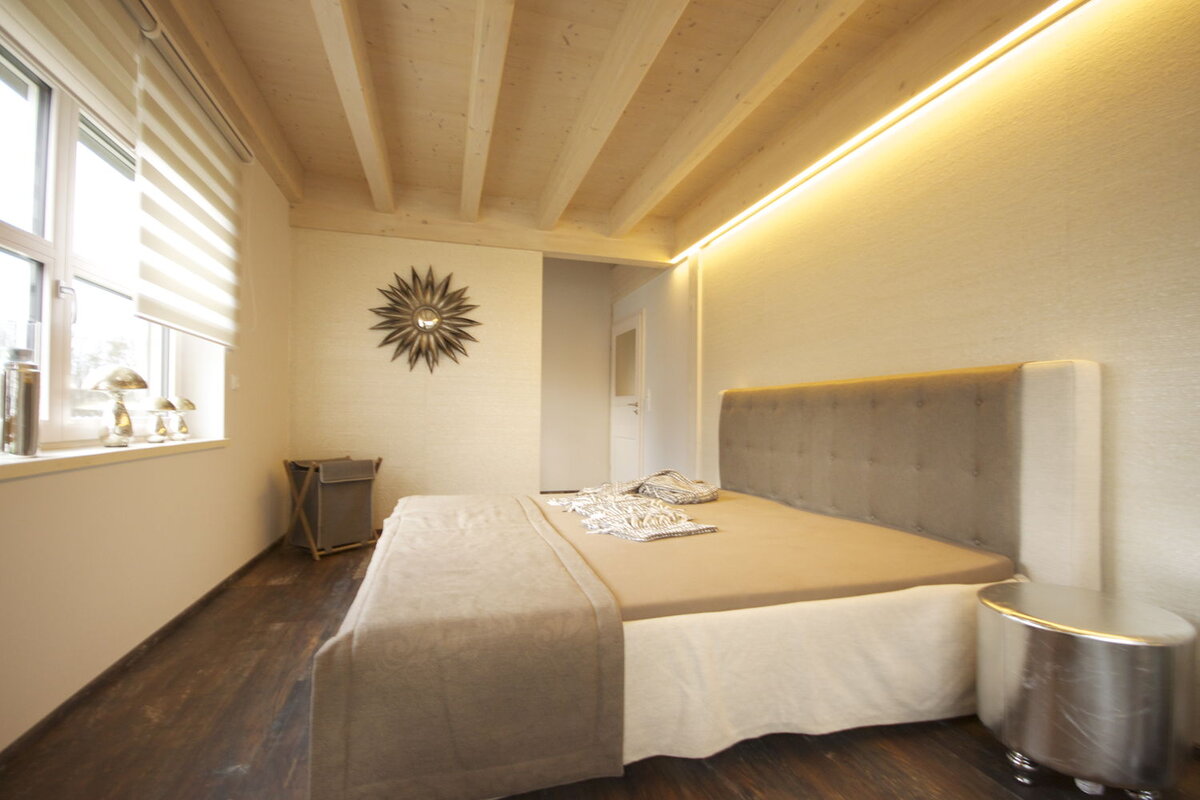 Das spannende Design, das sich nicht nur durch das versetzte Pultdach entwickelt, sondern auch die ausgewählten ökologischen Materialien, laden zum luxuriösen Wohnen ein. Modernität kombiniert mit Funktionalität unter massiven Holzbalken vereint, vermitteln ein harmonisches Bild.