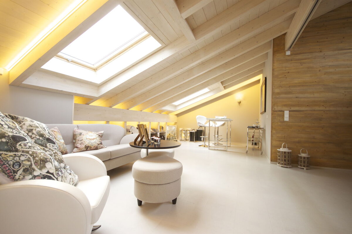 Das große Studio im Dachgeschoss, kann sehr vielseitig genutzt werden. Der edle weiße Korkboden, kombiniert mit der rustikalen Holzdecke sorgt mit für ein positives Raumklima, und verleiht dem Holzhaus eine gute Mischung aus Tradition und Moderne. Das anderthalb geschossige Haus ist vielseitig nutzbar.