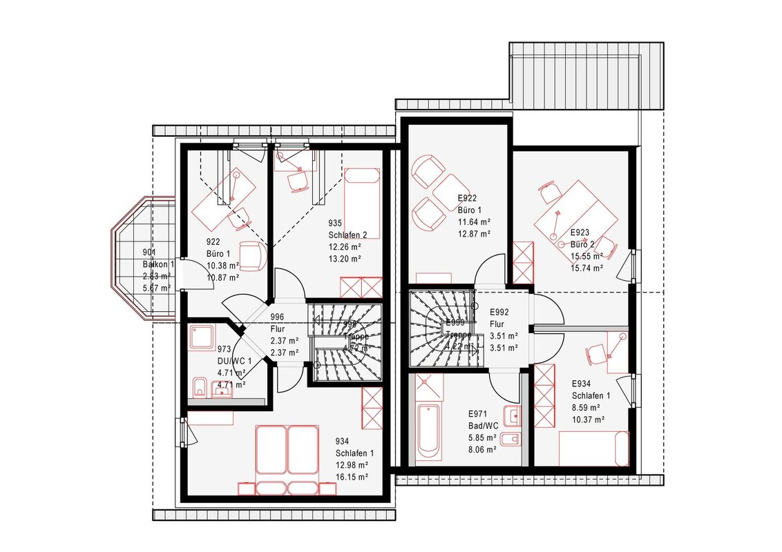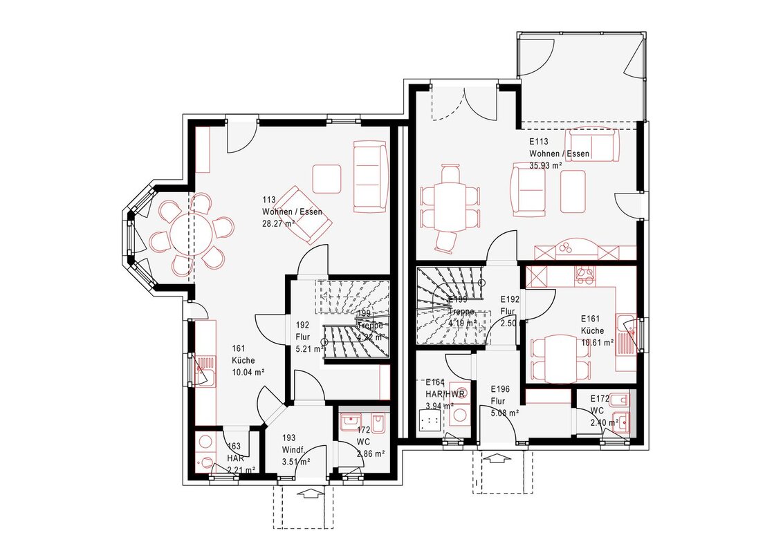 Bauen im Duo ist besonders bei Familien mit Kindern ein neuer Trend. Die Vorteile für die Baufamilien liegen auf der Hand: Gemeinsames Bauen spart viel Geld, bringt die gute Nachbarschaft gleich mit und bietet selbst auf kleiner Grundfläche alles, was modernes Wohnen heute ausmacht. Schon auf den ersten Blick überzeugt das Musterhaus durch eine moderne, offene Architektur - ausgestattet mit vielen Extras wie Wintergarten, Erker und Balkon.