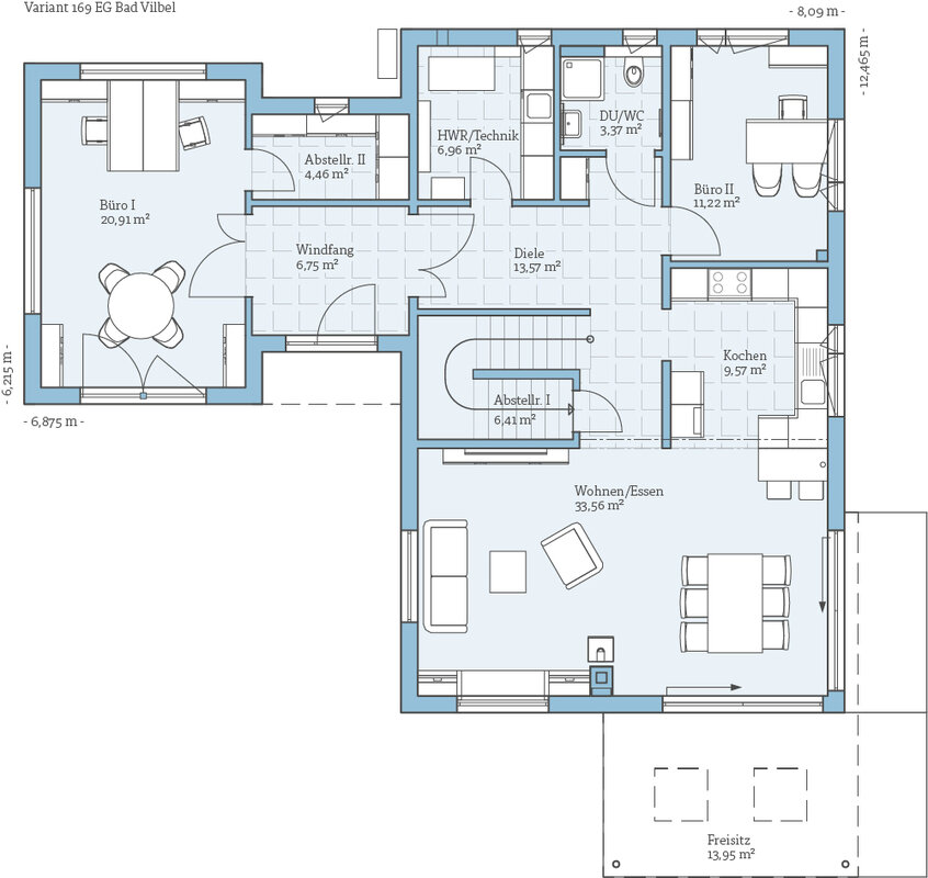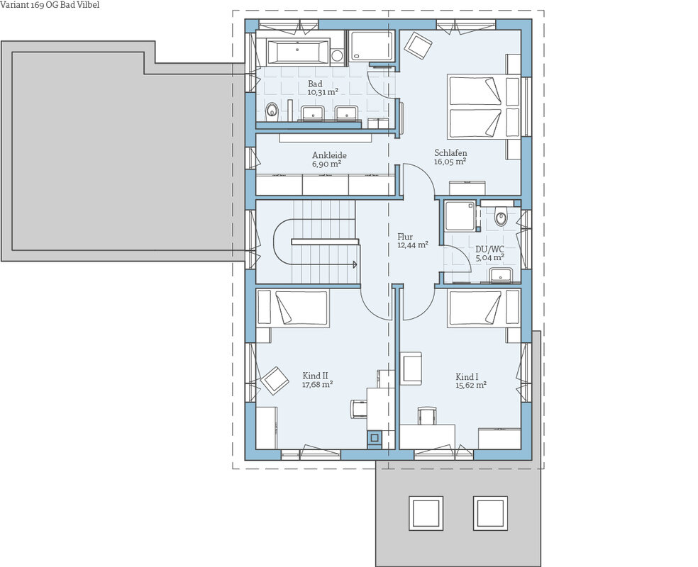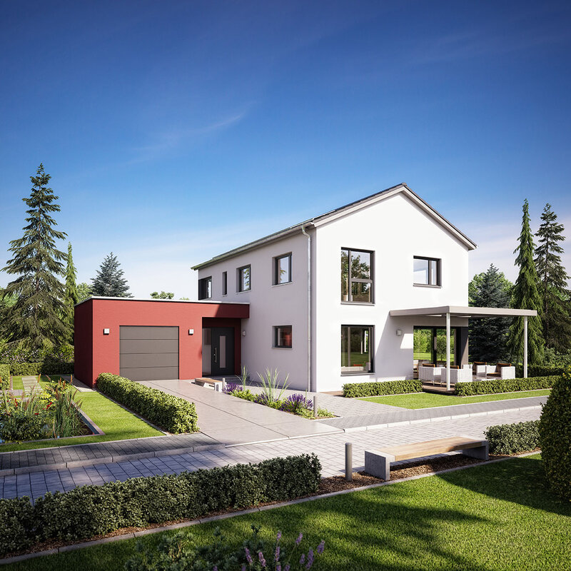 Das Musterhaus Variant 169 bietet mit seinem flachen Satteldach und den zwei Vollgeschossen viel Raum. Im Erdgeschoss sind der offene Wohn-, Ess-und Kochbereich, ein Arbeits-oder Gästezimmer, der Hauswirtschafts-bzw. Technikraum und ein Duschbad untergebracht. Ein separater Flachdachanbau mit Garage ermöglicht den wettergeschützten Zugang zum Haus, der Kellerersatzraum bietet praktische Abstellfläche. Im Obergeschoss befinden sich das Elternschlafzimmer mit eigenem Bad und Ankleide sowie zwei Kinderzimmer und ein Duschbad.