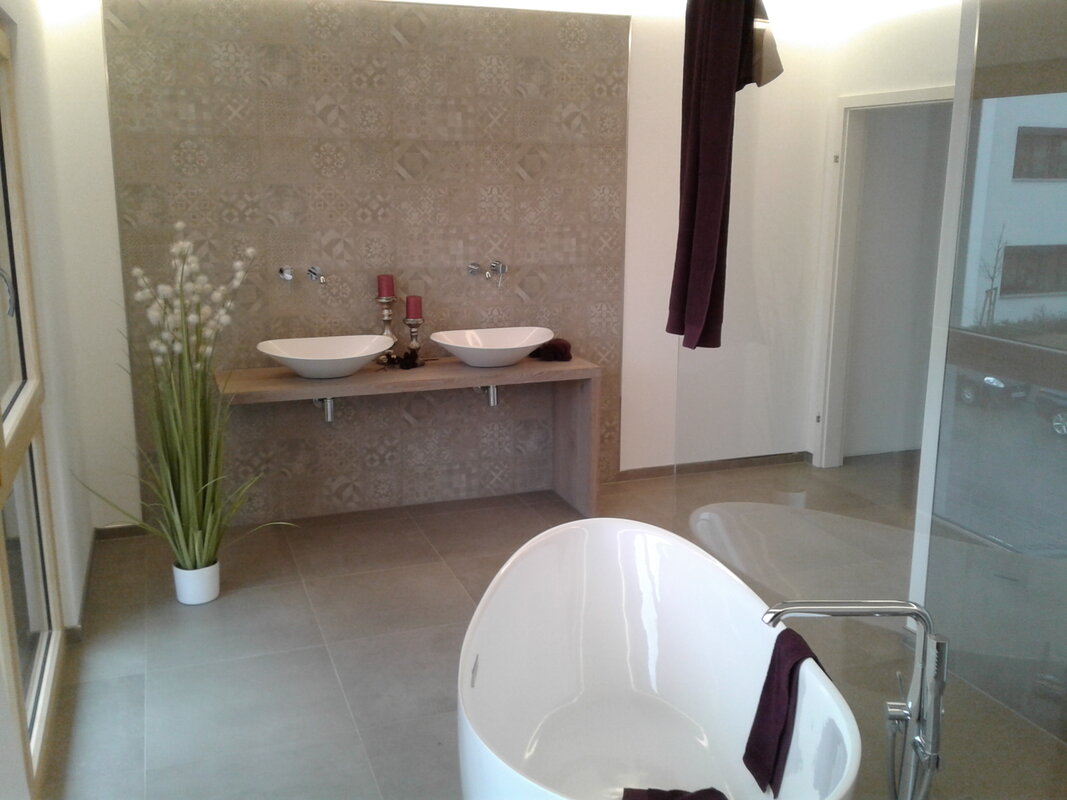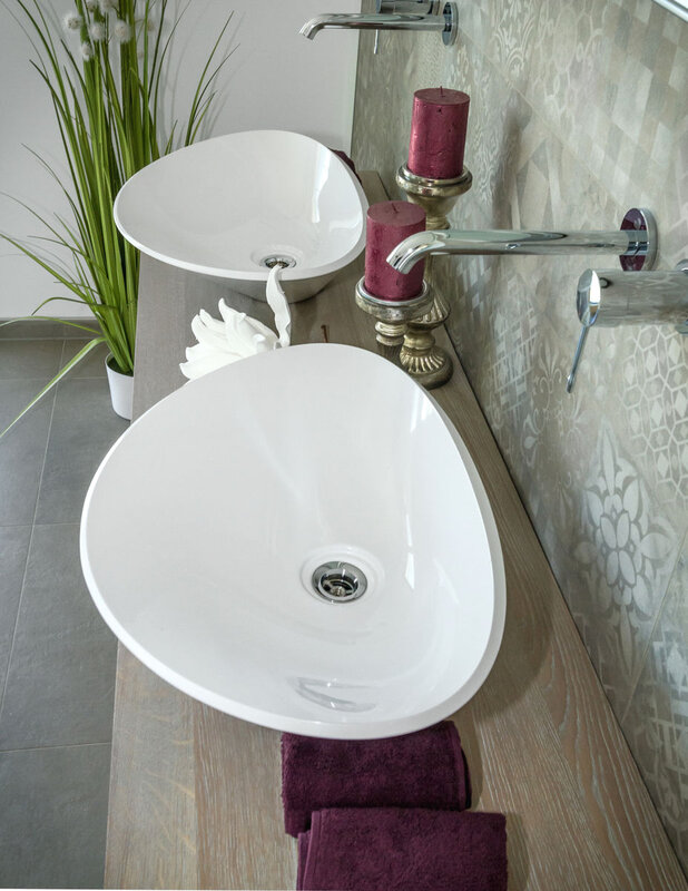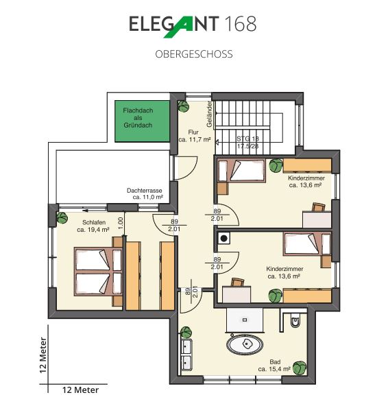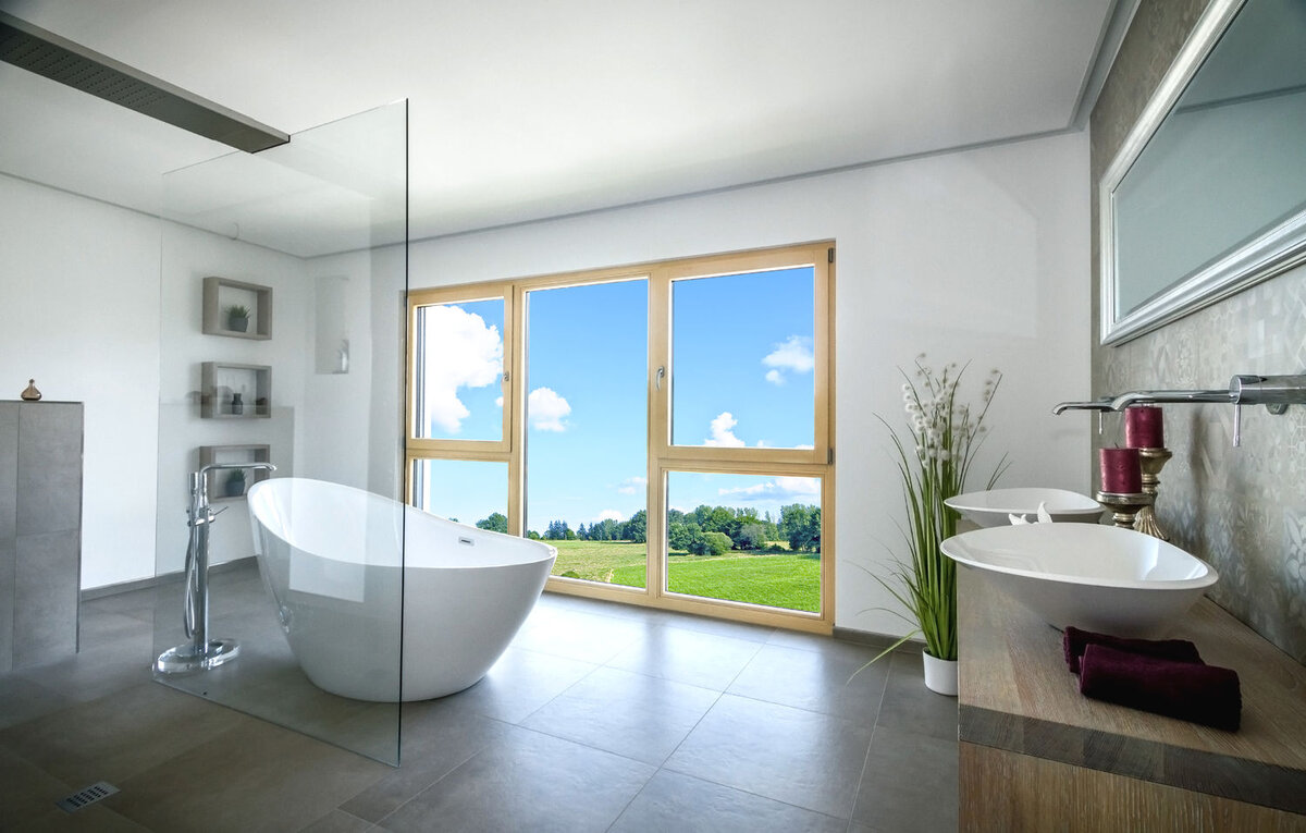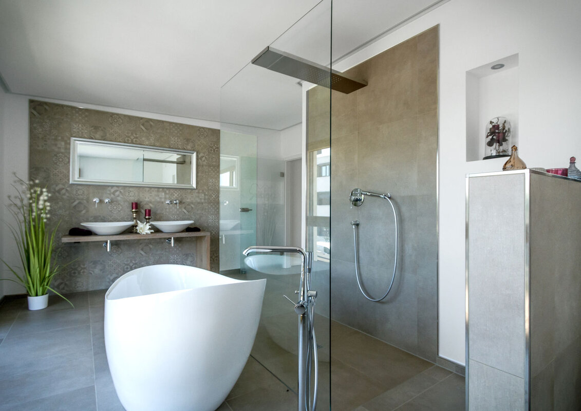 Auch das Bad des Obergeschosses hat in seiner Großzügigkeit den Charme einer Wellnessoase. Und hier machen es wieder die Details. Sei es nun der Balkon, die Eingangsüberdachung oder der Kamin, sie sind ein Muss und gehören einfach zum Haus dazu. Ein gelungenes Raumkonzept auf ca. 168 Quadratmeter Wohnfläche. Was will man mehr? Wandelbar ist es auch. Wenn an Stelle des Flachdaches ein Walmdach zur Ausführung kommt, dann wird das ELEGANT 168 zu einer Stadtvilla mit besonderem Stil.
