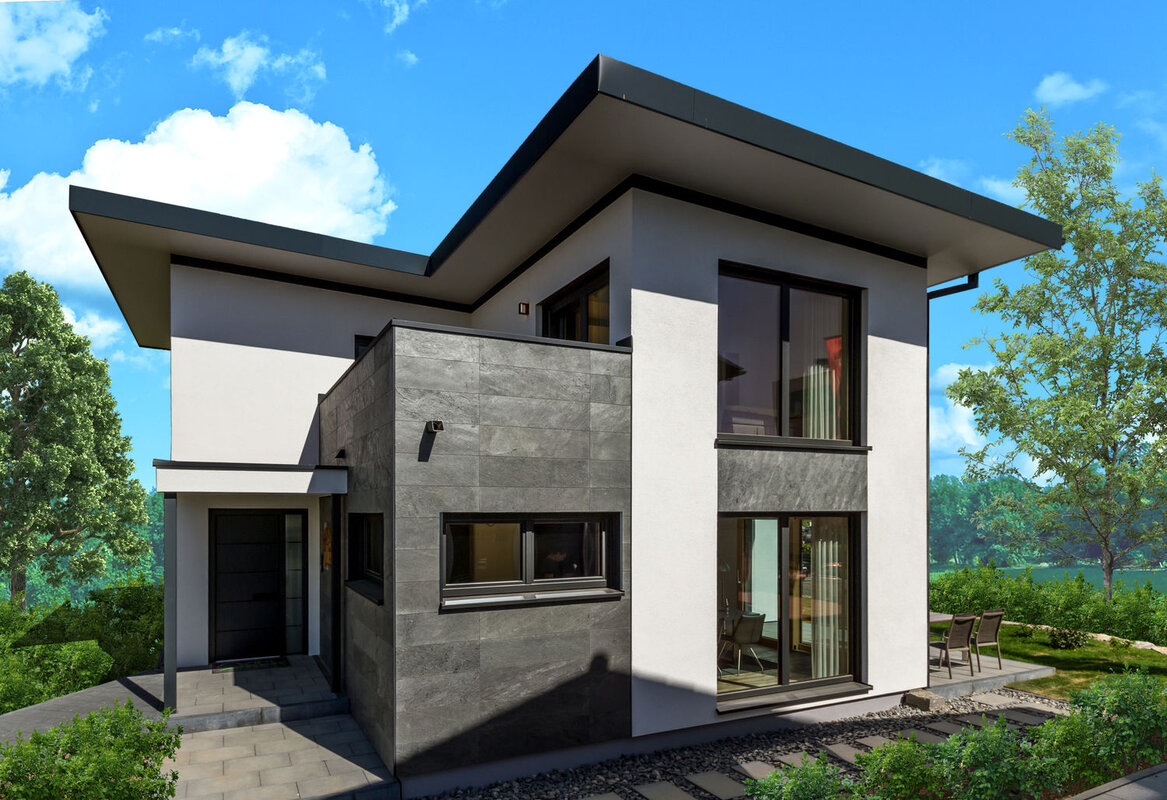Auf ca. 168 Quadratmeter Wohnfläche bietet dieses Haus ausreichenden und anspruchsvollen Platz für bis zu fünf Personen. Der interessante Kubus mit seiner sanft geneigten Flachdachform und dem repräsentativen Dachüberständen, seinen Vor- und Rücksprüngen sowie den großen Glasflächen lässt für sich wirken.