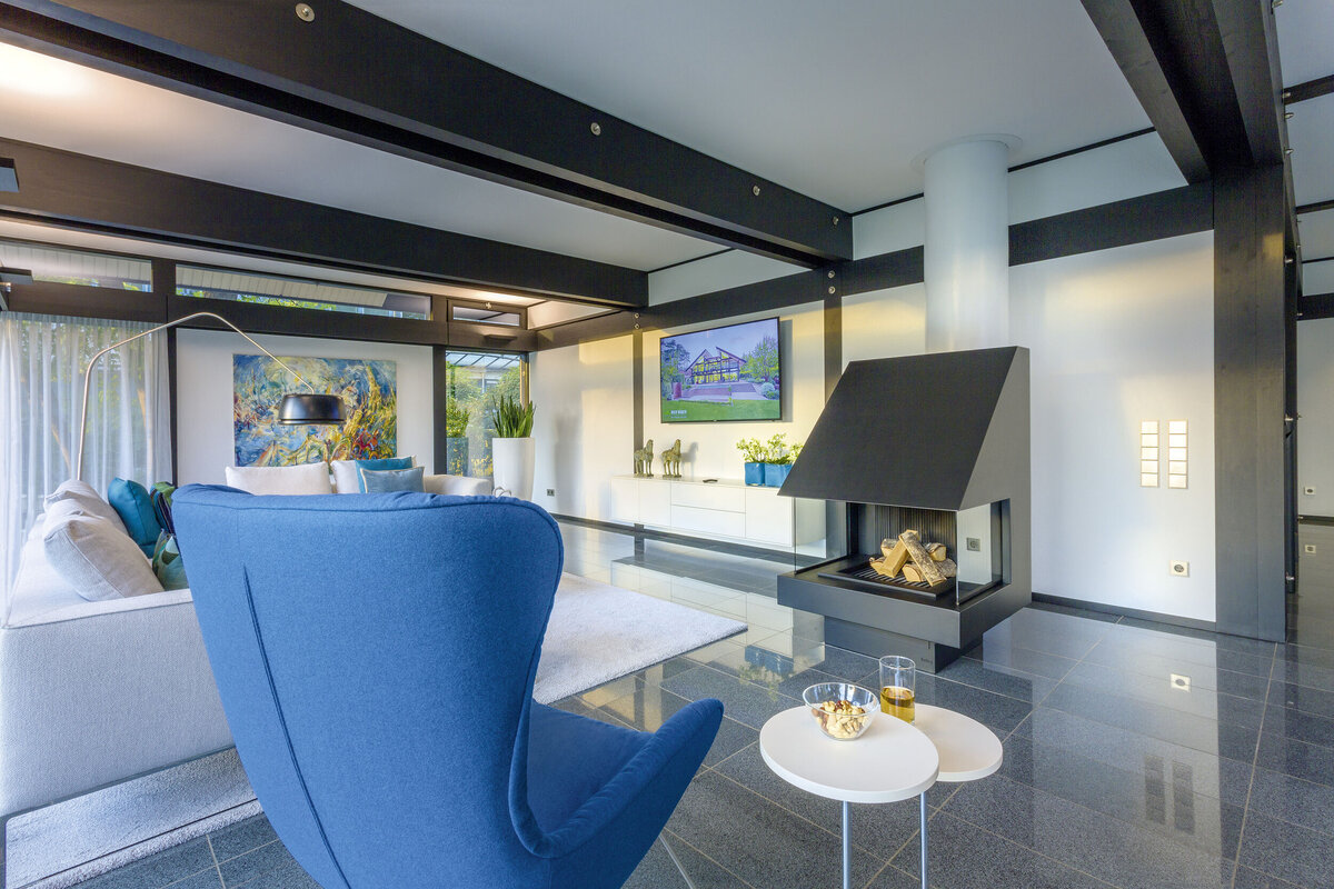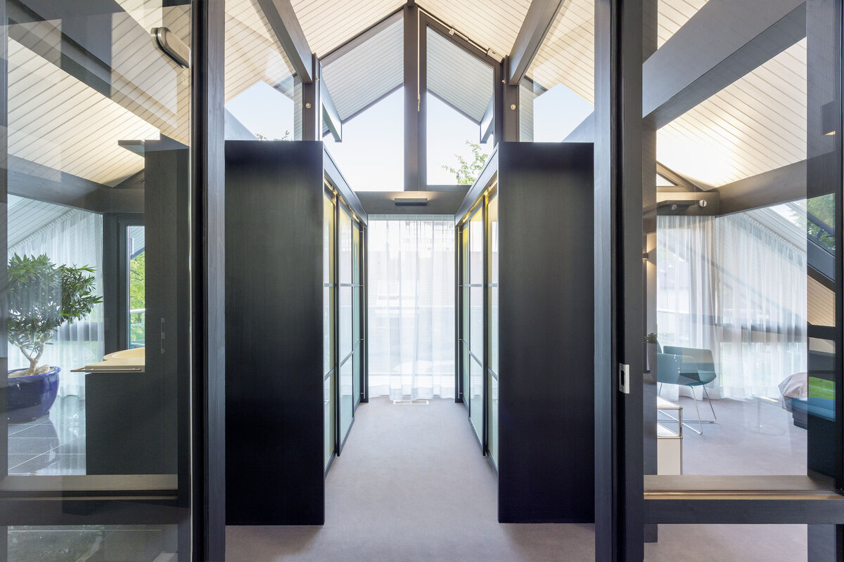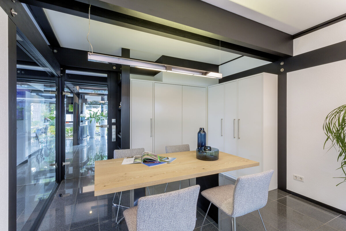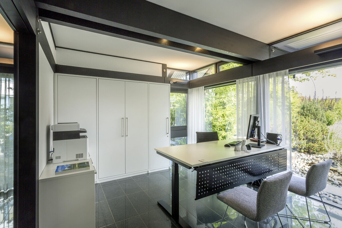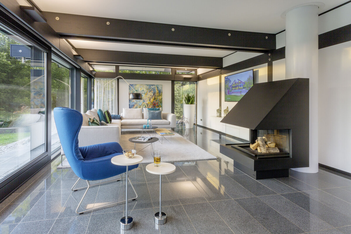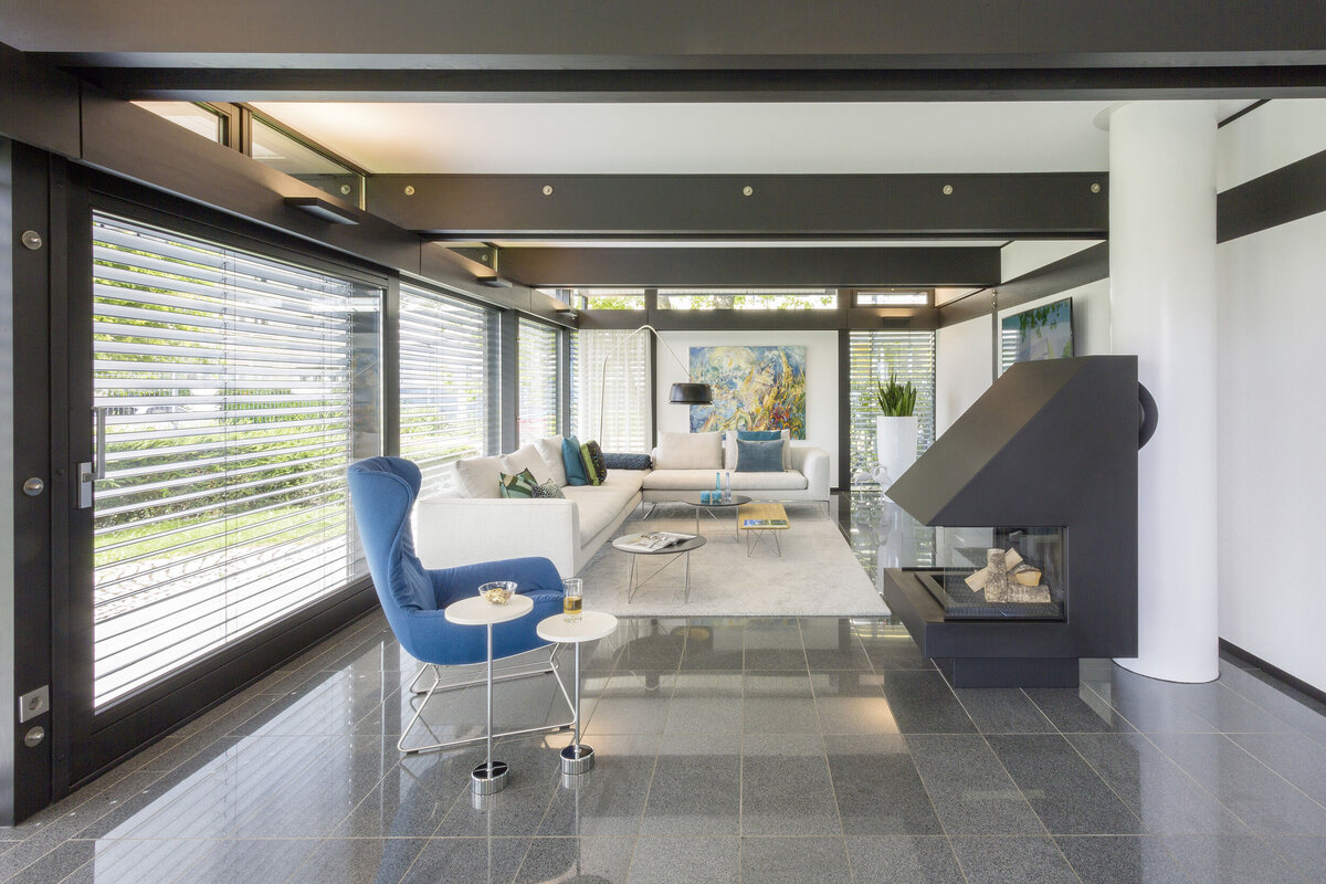 Die charakteristische, großflächige Verglasung bringt im HUF Haus ART 5 in Fellbach viel natürliches Licht ins Innere und bietet facettenreiche Ausblicke auf die umgebende Natur – so können Augen und Sinne in alle Richtungen schweifen. Entdecken Sie das einzigartige HUF HAUS FEELING vor Ort in unserem Musterhaus!
