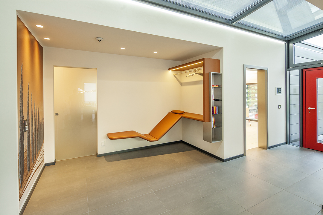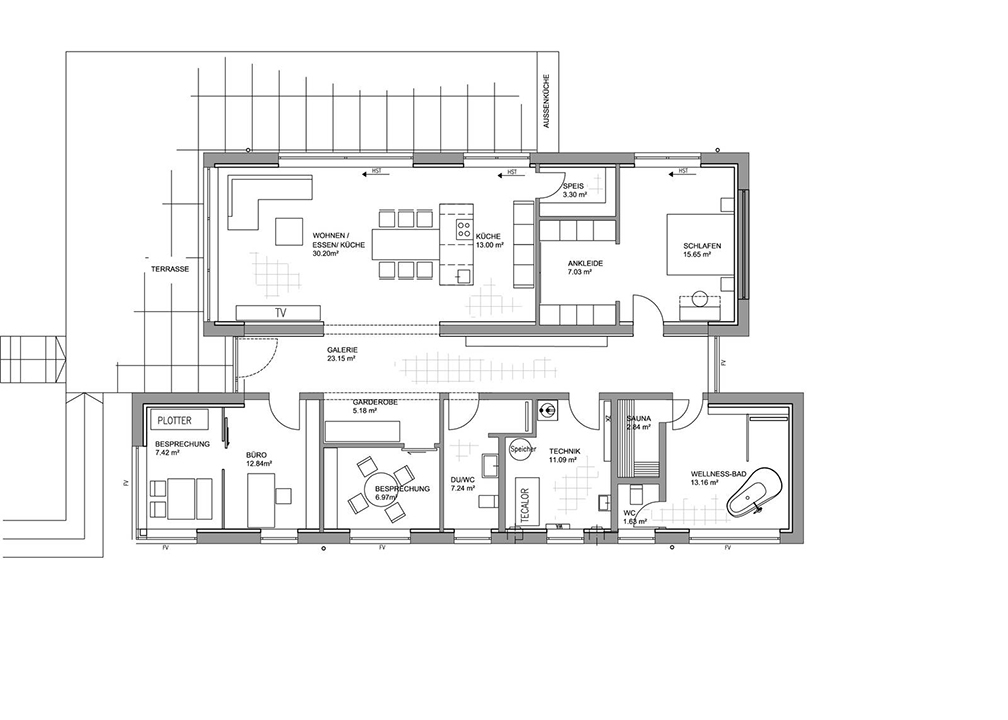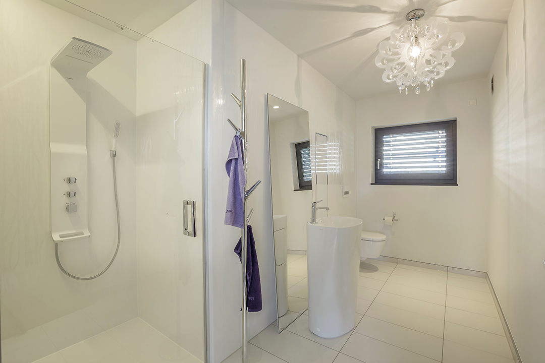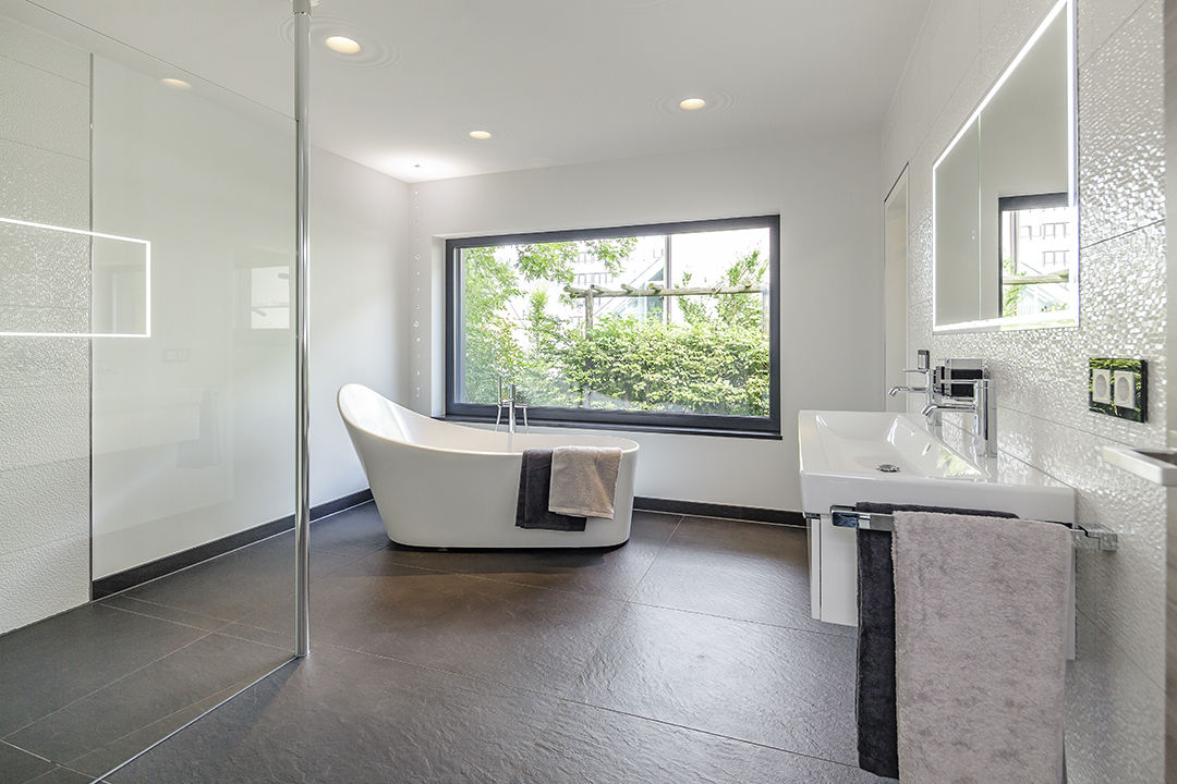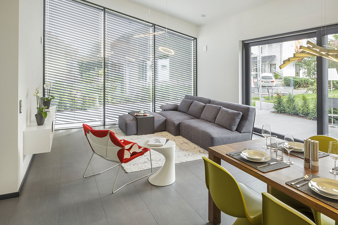 LUXHAUS|open.Der betont grafisch gehaltene Entwurf spielt mit zwei Baukörpern, die eine gläserne „Schattenfuge“ gleichermaßen trennt und verbindet. Eine dachintegrierte Photovoltaikanlage sowie Photovoltaikglas in der Überkopfverglasung sorgen für die energetische Versorgung des Plus-Energie-Hauses, das von einer Luft-Wasser-Wärmepumpe mit aktiver Kühlungsfunktion und kontrollierter Be- und Entlüftung mit Wärmerückgewinnung beheizt wird. Der repräsentative Wohn-Ess-Kochbereich verfügt über eine Raumhöhe von über 4 Metern. Der breite Flur fungiert als ein Hybrid aus Atrium und Wintergarten. Schlafräume und Bäder sowie die im Musterhauskontext als Büros genutzten Zimmer liegen eher zurückgezogen, was bereits an der Fenstergestaltung ablesbar ist.
