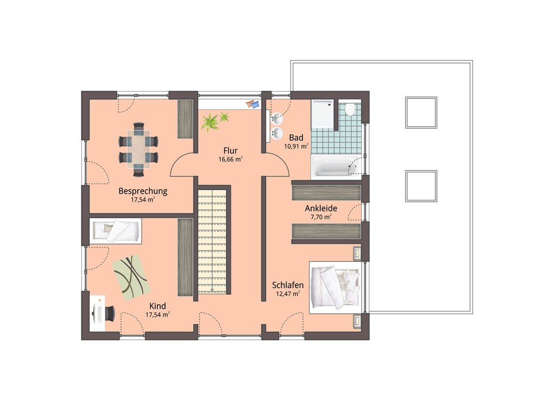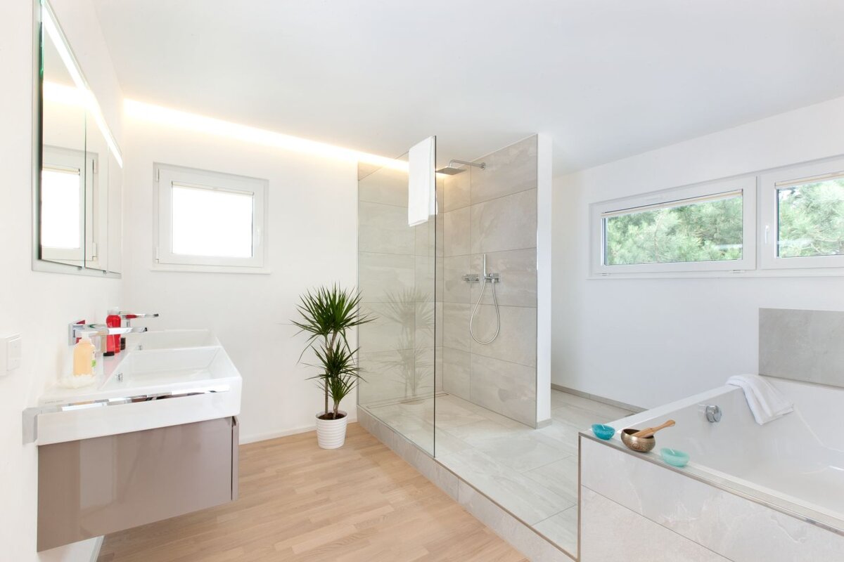 Der nach oben offene Dachraum unterstreicht das Gefühl von Weite und Offenheit. Das Familienbad mit weiterem Zugang zur Elternankleide ist streng gegliedert. Während Dusche, Badewanne und WC auf einem Podest eine Einheit bilden, ist der große Waschtisch von diesem abgetrennt. Die Ankleide erhält durch zwei Tageslichtspots genügend Licht und führt weiter ins elterliche Schlafzimmer. Die Kinderzimmer sind gleich groß gestaltet und nach Westen ausgerichtet. Sofern der Bebauungsplan es zulässt, besteht sogar die Möglichkeit, die Kinderzimmer mit Schlafemporen auszustatten. Modernste Technik und ausgewählte Materialien unterstreichen die exklusive Ausstattung des Hauses. Viele interessante Details erwarten den Besucher. Sprechen Sie ruhig einen unserer Fachberater an. Diese sind gerne bereit, Ihnen die Flexibilität des Grundrisses näher zu erläutern.
