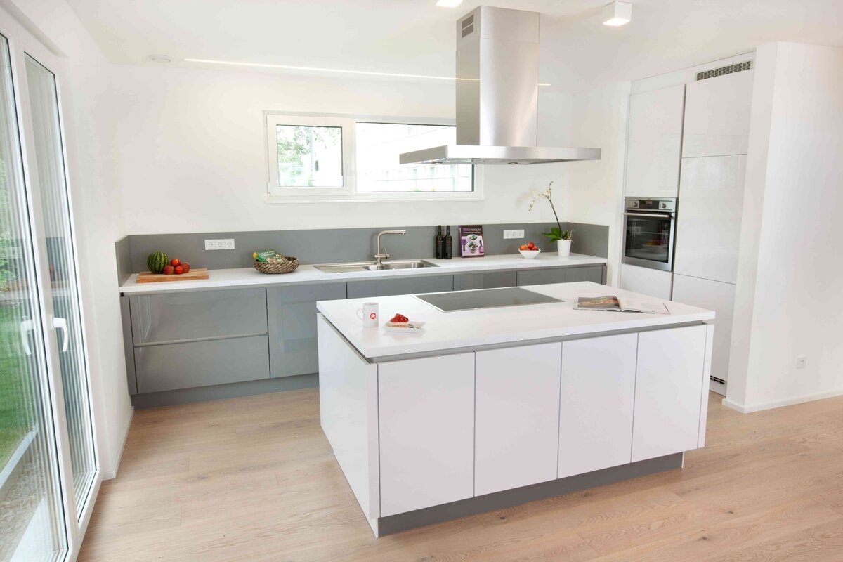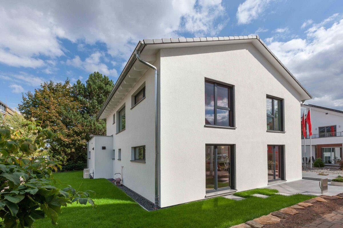 Jung und frisch präsentiert sich unser Musterhaus in Fellbach. Der schlichte Baukörper mit klassischem Satteldach lehnt sich an den Bauhausstil an und erstrahlt in modernem und puristischem Design. Viele Fensterflächen setzen an dem weiß verputzen Gebäude interessante Akzente. Der mit Eternitplatten verkleidete eingeschossige Flachdachanbau schiebt sich aus dem sonst kompakten Baukörper heraus und bildet zusammen mit dem Carport einen geschützten Eingangsbereich.