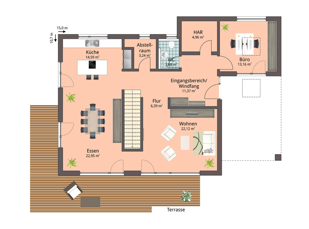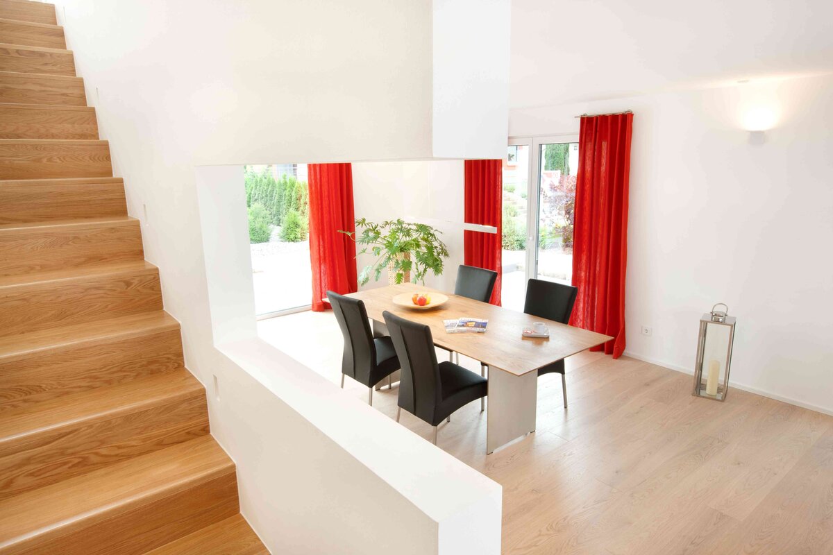 Das Entré ist großzügig und übersichtlich gestaltet. So kann sich der Besucher schnell im Haus orientieren. Neben einer Garderobe befindet sich hier auch der Zugang zum Büro. Ebenso sind von dort die Technik, ein Abstellraum und das Gäste-WC schnell erreichbar. Eine einläufige Treppe teilt den sonst offen gestalteten Grundriss in verschiedene Zonen. Dadurch wird der Wohnraum geschickt vom Koch- und Essbereich abgetrennt und erzeugt einen geschützten Rückzugsort. Harmonisch fließen die einzelnen Räume ineinander über. Die Küche und der Essbereich sind zudem äußerst großzügig gestaltet und bieten genügend Platz für die ganze Familie. Ein Einschnitt in der Treppenwand gibt zusätzliche Blickbeziehungen zwischen den einzelnen Zonen frei und unterstreicht den offenen Charakter des Hauses.