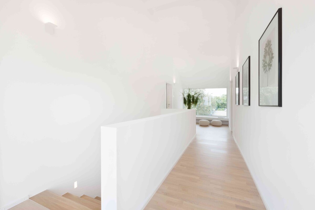Die geschlossene Treppe in Faltwerkoptik, gerahmt zwischen zwei Wandscheiben, führt ins helle Obergeschoss. Hier sind die Schlafräume, eine Elternankleide und das Familienbad untergebracht. Optional bietet der Flur Platz für ein separates Kinderbad, welches in unserem Musterhaus als gemütliche Leseecke gestaltet ist. Eine übergroße Fensterbank wird dabei zur Sitzbank umfunktioniert und lädt zum Lümmeln ein.
