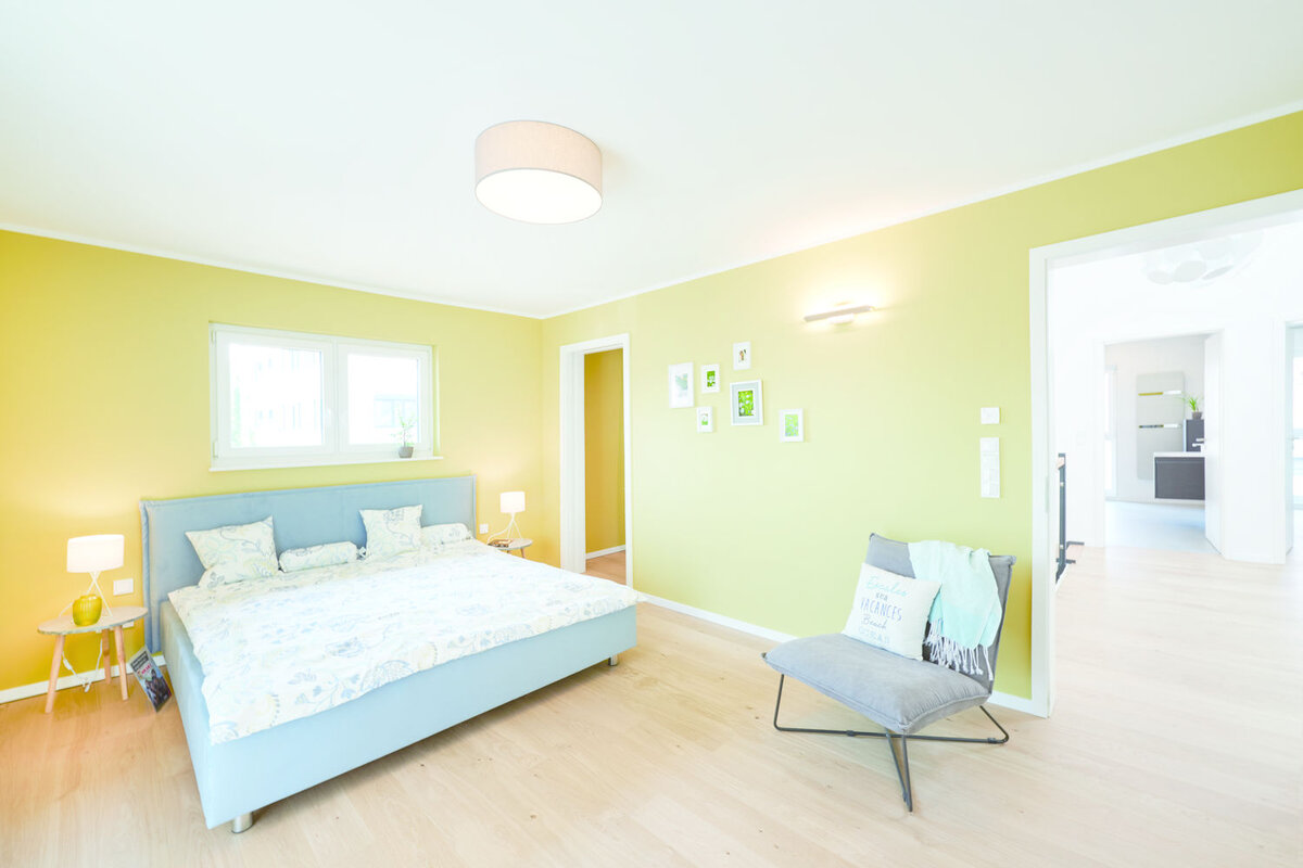 In das Obergeschoss mit Galerie führt eine zentral angeordnete Treppe. Hier befindet sich ein Schlafzimmer nebst Ankleide und Bad sowie 3 Kinderzimmer, die alternativ als Hobbyraum, weiteres Büro, Gäste- oder ähnliches nutzbar sind. Zwei kleine Balkone eröffnen dabei den Zugang zur Natur.