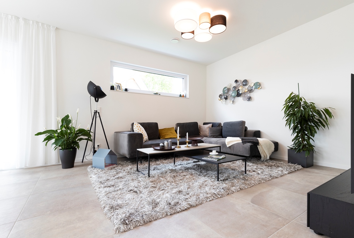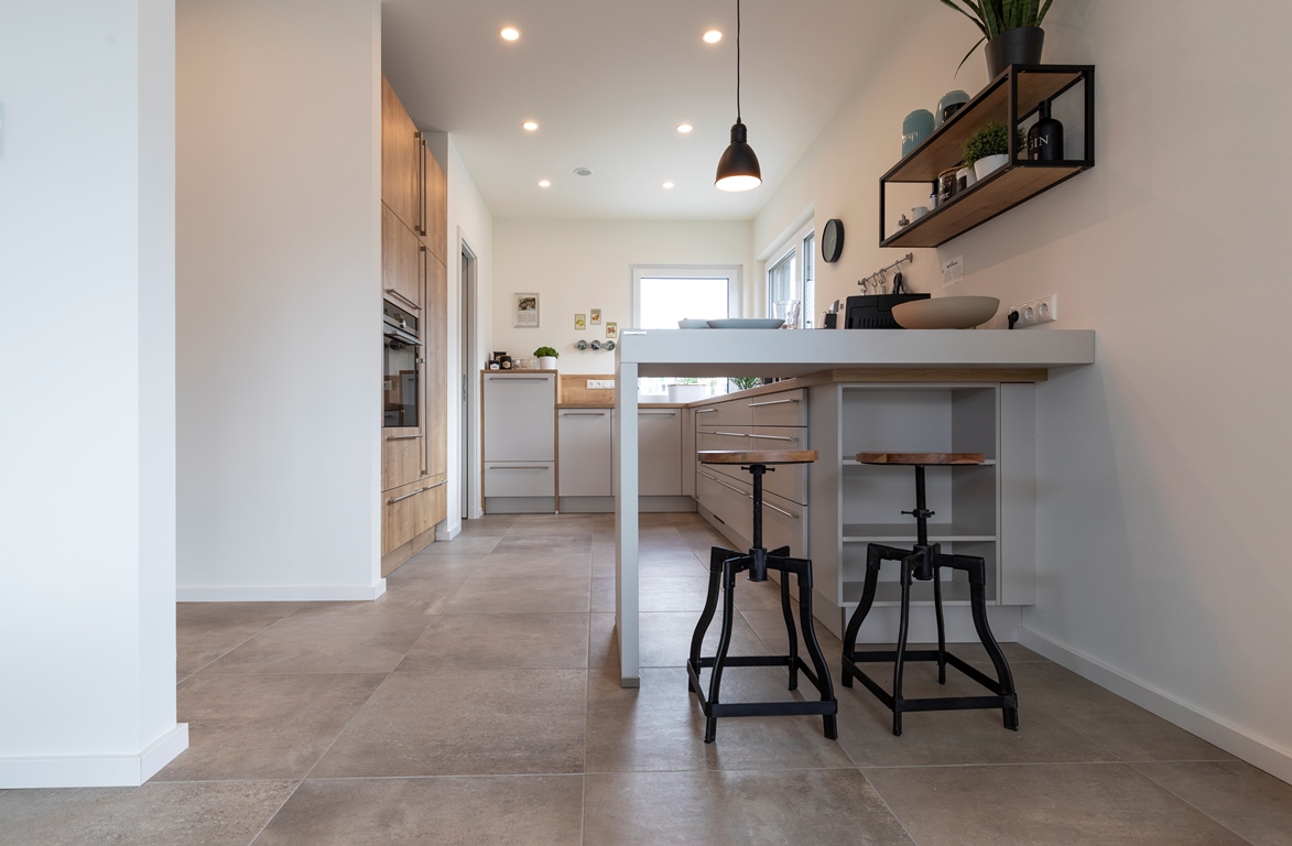 Das Musterhaus Variant 35-173 verfügt über einen hohen Kniestock (160 cm) und ein Dach mit einer 35°-Neigung. Auf einer Wohnfläche von rund 155 m² bietet das Haus genügend Platz für die ganze Familie. Klare und großzügige Wohnräume sowie ein offener Wohn- und Essbereich im Erdgeschoss sorgen für lichtdurchflutete Räume. Im Treppenaufgang ist ein Kniestockfenster verbaut, das für ausreichend Helligkeit sorgt. Über die moderne Treppe aus Buchenholz, gelangt man in das Dachgeschoss. Dort ist genug Platz für insgesamt drei Schlafzimmer, eine Ankleide, einen Hauswirtschaftsraum und ein großes Familienbad.