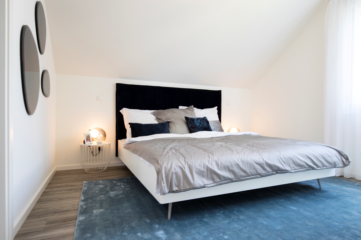Ein weiteres Highlight ist der Tageslichtspot im Ankleideraum: Da in der Ankleide meist jeder Zentimeter zählt und man durch Fenster- oder Dachflächenfenster wertvollen Stauraum verliert, wurde dort ein Tageslichtspot eingeplant. Durch den Spot fällt natürliches Licht in die fensterlose Ankleide. Dies spart Energie und sorgt für eine angenehme Helligkeit. Auch bei diesem Ausstellungshaus setzt Hanse Haus auf smarte Haustechnik. Das intelligente Smarthome-System von LOXONE übernimmt die Vernetzung von Licht- und Verschattungssteuerung, regelt die Heizung und sorgt für Einbruchschutz.