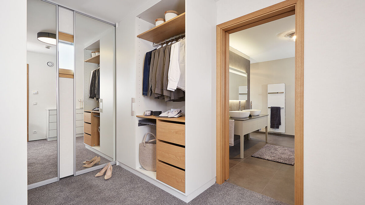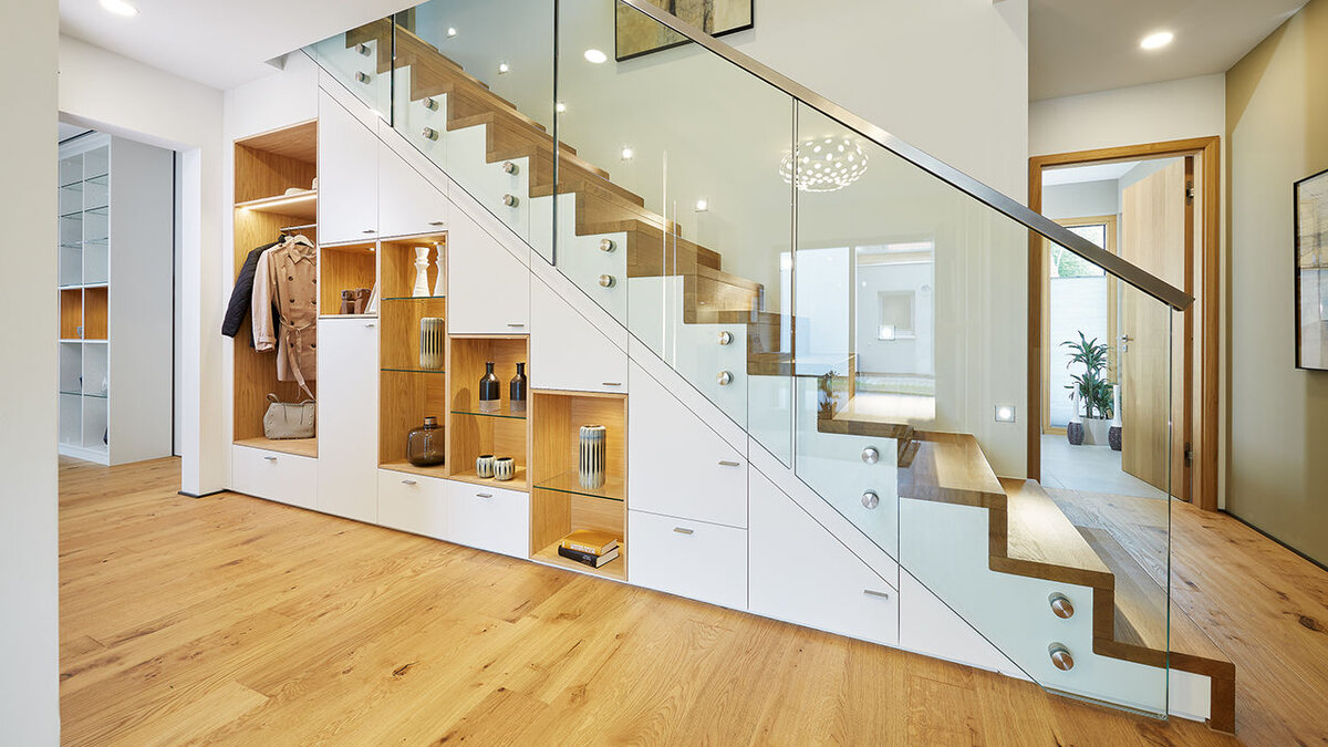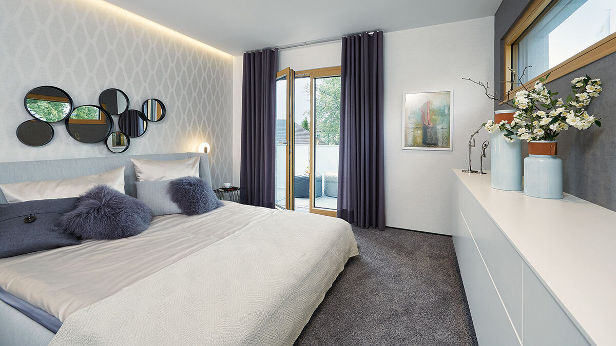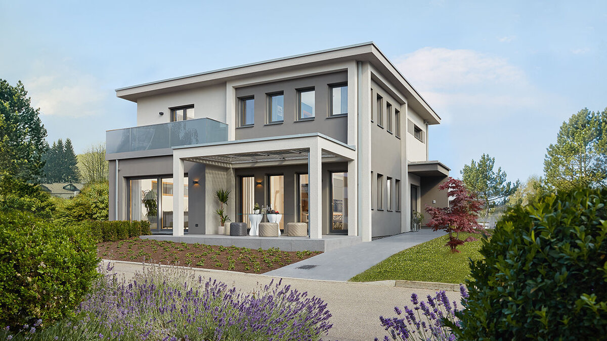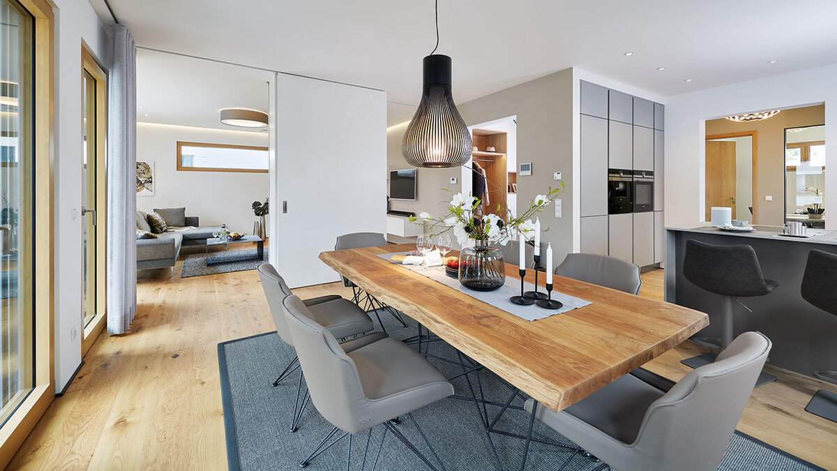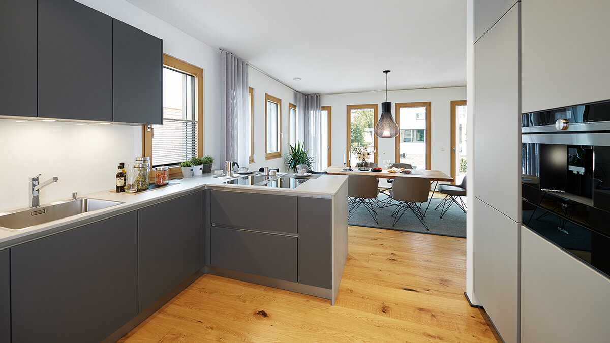 Dieses Einfamilienhaus in Fellbach vereint Gegensätze – außen gerade Linien, kubische Formen und kühle Farben, innen gemütliche Wohnbereiche, heimelige Atmosphäre und warme Holzelemente. Neben diesem modernen und doch behaglichen Erscheinungsbild überzeugt die Stadtvilla zudem durch maximale Energieeffizienz und intelligente Haussteuerung. Das elegante Stadthaus bietet mit insgesamt 220 Quadratmetern großzügiges Wohnen auf zwei Vollgeschossen. Dank PV-Anlage, Batteriespeicher und extra stark gedämmter Gebäudehülle erfüllt das Ausstellungshaus den Energiestandard KfW 40 Plus.